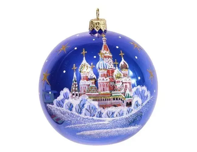 Грандиозная идея от наших мастеров – прозрачный, словно ледяной, стеклянный елочный шар с 3D-изображением легендарного храма Василия блаженного. Яркий, реалистичный рисунок на прозрачном фоне смотрится очень выигрышно. А заснеженные кустарники в холодных тонах и звездочки жизнерадостного желтого цвета придают композиции особый шарм и завершенный вид.