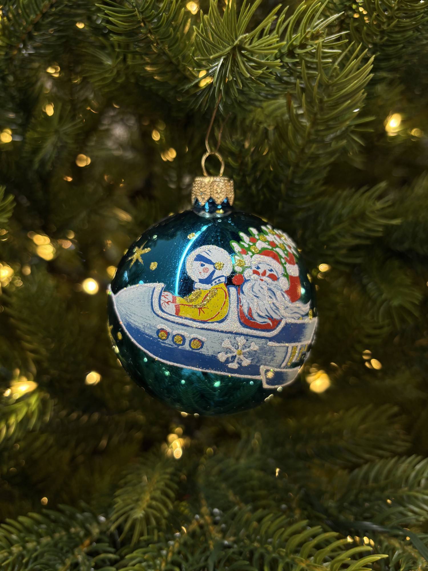 Стеклянный шар «Полёт» диаметром 70 мм — это оригинальное новогоднее украшение, выполненное из качественного стекла. На шаре изображён увлекательный сюжет: ракета с космонавтом и Дедом Морозом внутри, которые отправляются в волшебное путешествие. Этот шар станет ярким акцентом в новогоднем декоре и привнесёт в праздничное оформление элемент волшебства и фантазии. Шар доступен в 3 вариантах цвета - розовый, бирюзовый и фиолетовый.