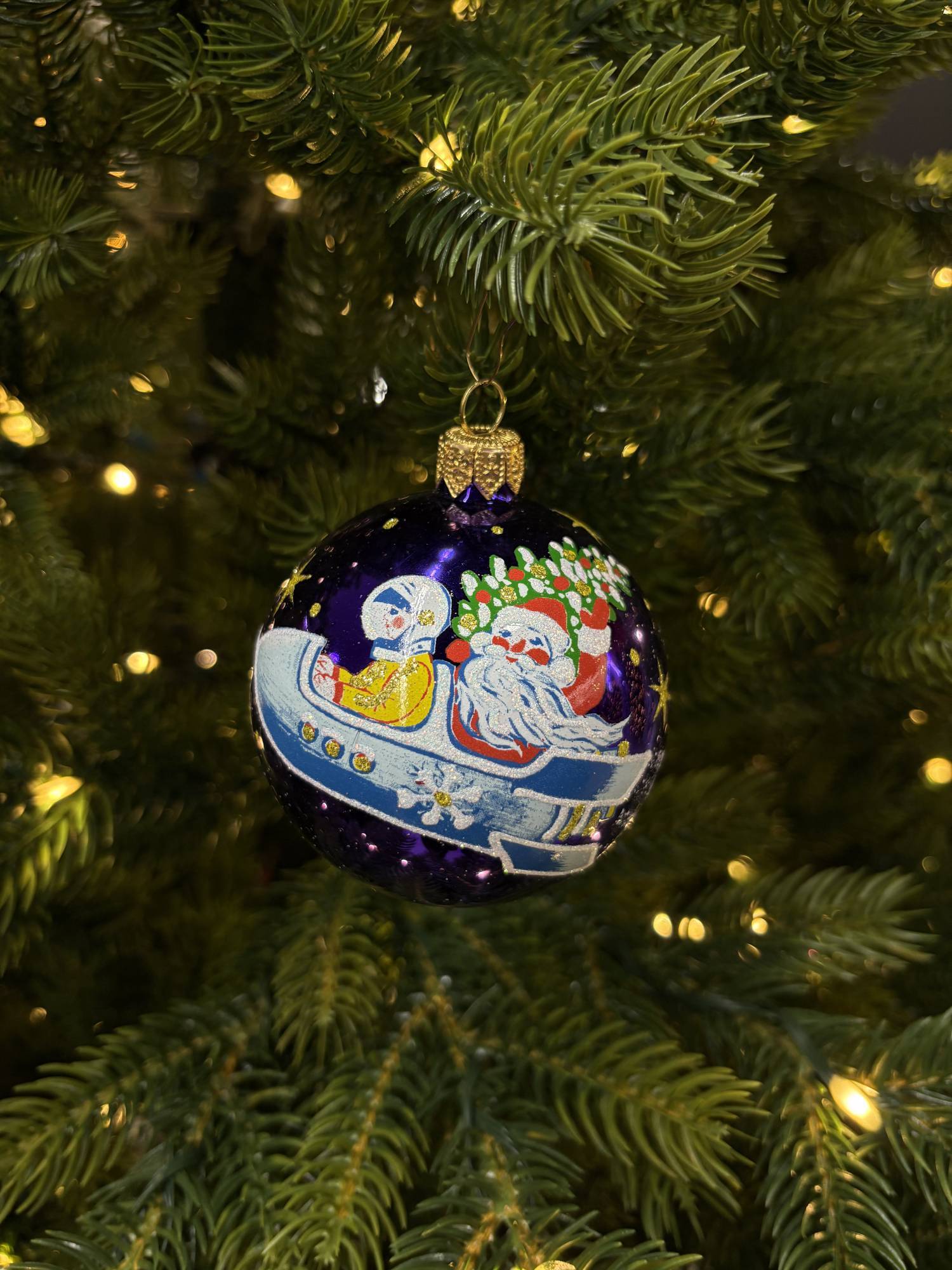 Стеклянный шар «Полёт» диаметром 70 мм — это оригинальное новогоднее украшение, выполненное из качественного стекла. На шаре изображён увлекательный сюжет: ракета с космонавтом и Дедом Морозом внутри, которые отправляются в волшебное путешествие. Этот шар станет ярким акцентом в новогоднем декоре и привнесёт в праздничное оформление элемент волшебства и фантазии. Шар доступен в 3 вариантах цвета - розовый, бирюзовый и фиолетовый.