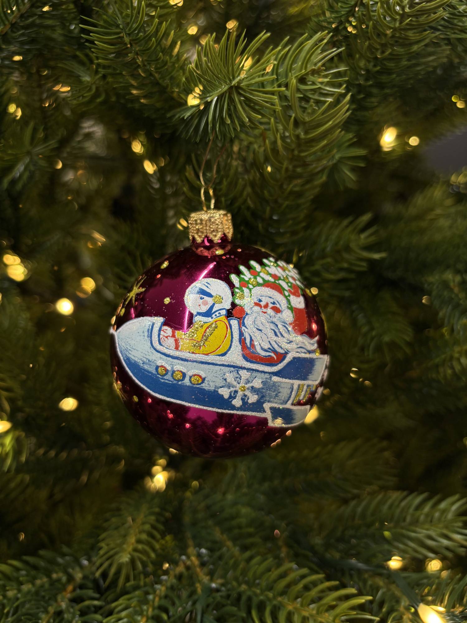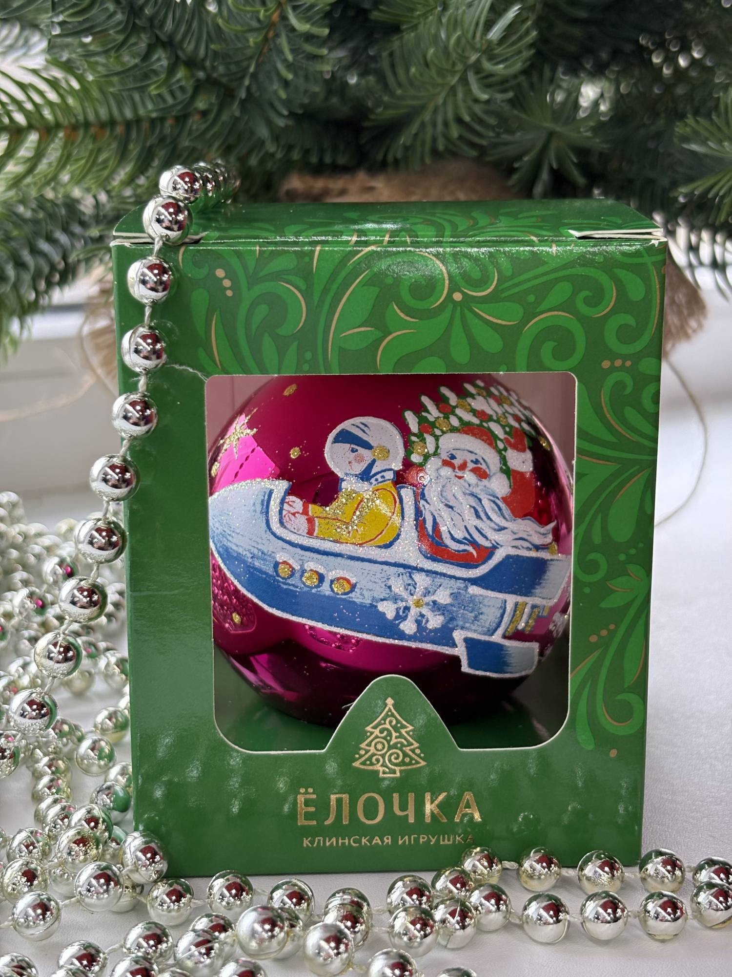 Стеклянный шар «Полёт» диаметром 70 мм — это оригинальное новогоднее украшение, выполненное из качественного стекла. На шаре изображён увлекательный сюжет: ракета с космонавтом и Дедом Морозом внутри, которые отправляются в волшебное путешествие. Этот шар станет ярким акцентом в новогоднем декоре и привнесёт в праздничное оформление элемент волшебства и фантазии. Шар доступен в 3 вариантах цвета - розовый, бирюзовый и фиолетовый.