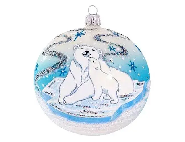Нежная, заботливая мама-медведица и милый медвежонок, доверчиво прильнувший к ней – до чего же трогательная семейная идиллия! Такая добрая картинка приятно волнует до глубины души. Дизайн елочного шара «Полярный» вызывает восторг – холодные оттенки на кристально прозрачном фоне, изящные белоснежные звездочки и неожиданное дополнение из сверкающей разноцветной крошки.