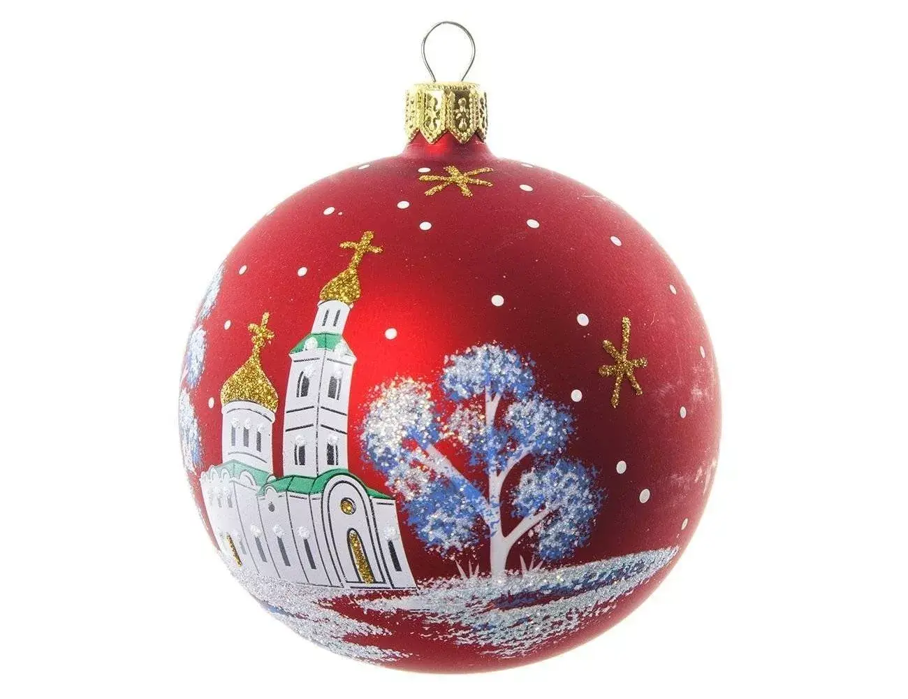 Рождественский пейзаж в светлых тонах на темно-красном фоне выглядит торжественно и берет за душу. Церковь с золотыми куполами, деревья, усыпанные снегом и фантастически красивый закат – вот они, родные просторы, при виде которых на глаза наворачиваются слезы счастья и гордости. Стеклянный елочный шар «Просторы» – идея для тех, кто умеет ценить прекрасное!