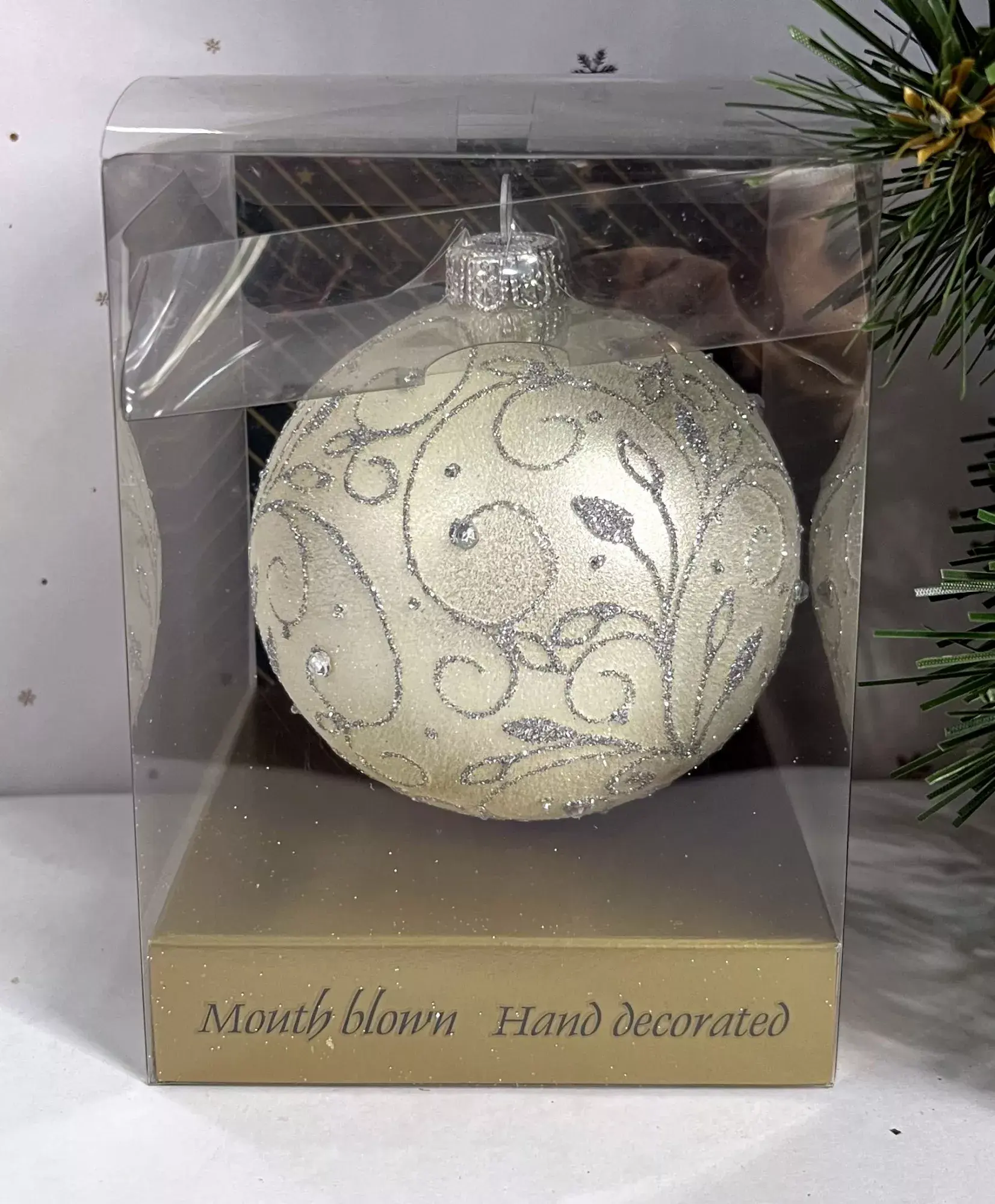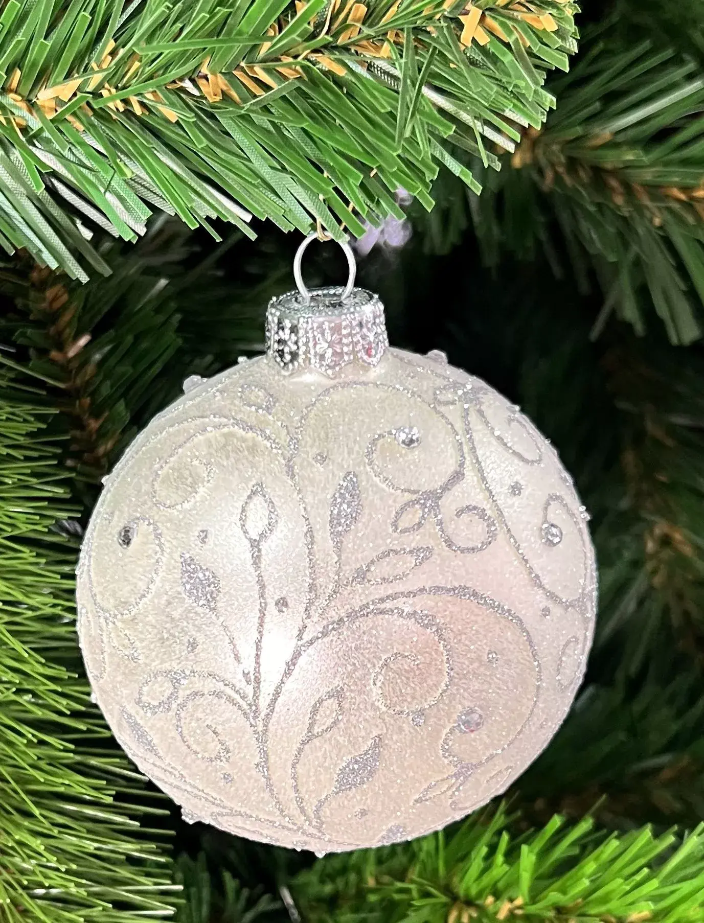 Элементы морозного узора в елочных украшениях всегда актуальны. Изящные лаконичные завитки с вкраплениями страз на шаре серебристо-белого цвета – это изысканное решение принадлежит известному бренду Irena. Такое великолепие выгодно выделяется на новогодней елке темного цвета. Выглядит шикарно!