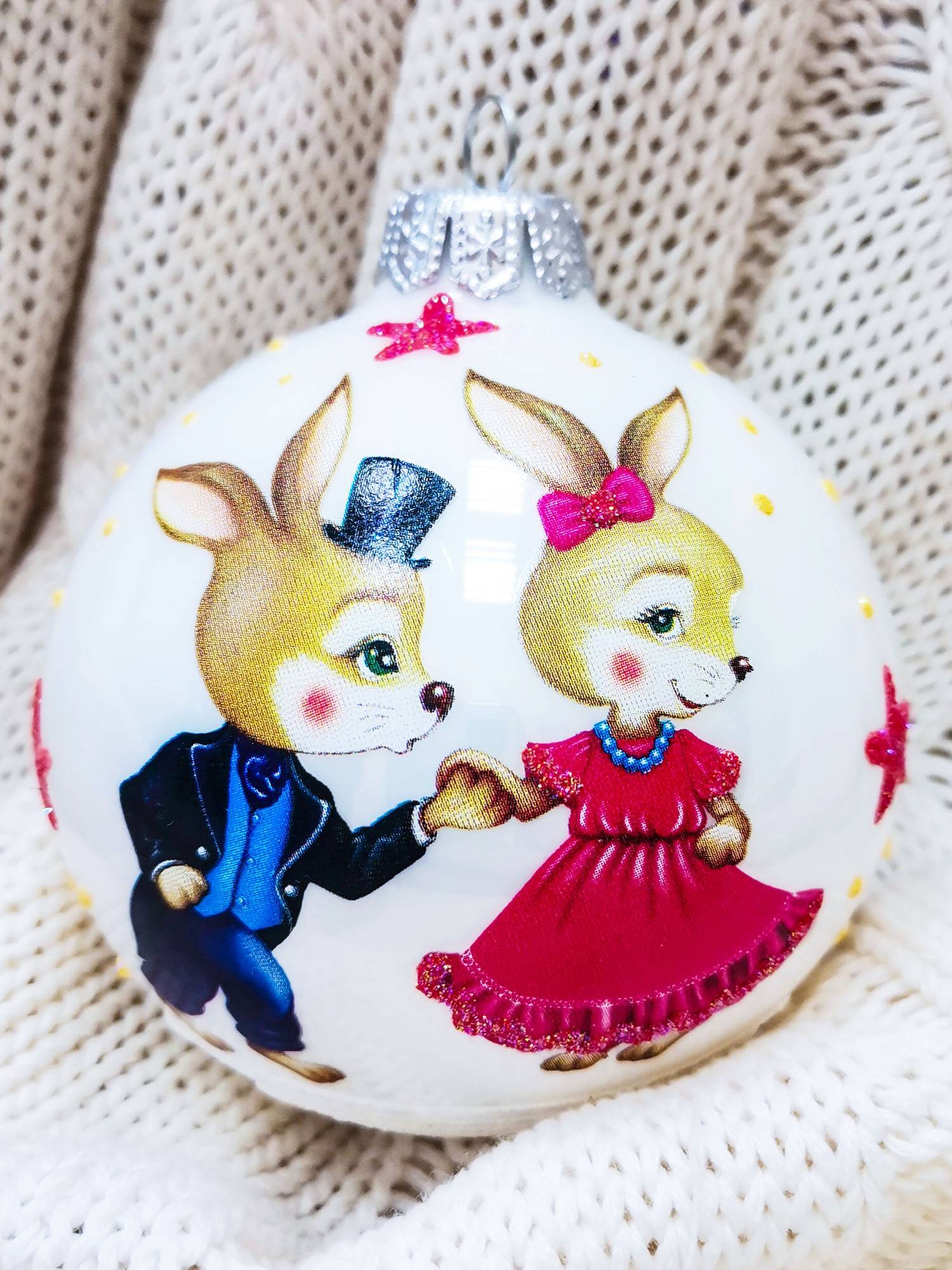 Вы еще не нашли свою вторую половинку? Приобретите елочный шарик «Сладкая парочка», и в новом году вы непременно встретите того, кто сделает вас счастливым. Очаровательная сладкая парочка кроликов в яркой элегантной одежде на белоснежном фоне радует глаз и моментально улучшает настроение. Пусть в новом году этот шар станет вашим любовным талисманом!