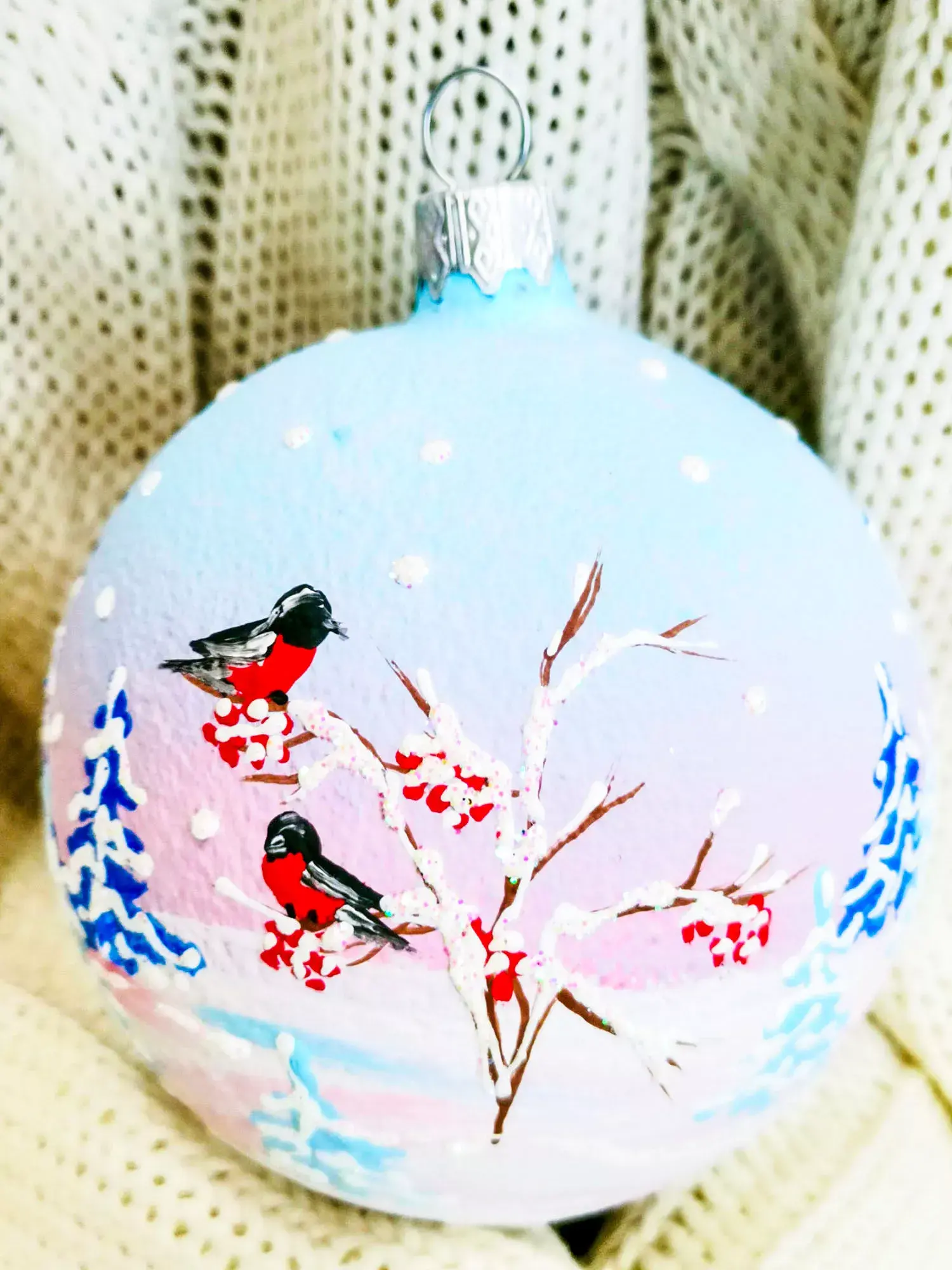 Рисунок на шаре «Снегири в зимнем лесу» выполнен в нежных тонах: белом, розовом и голубом. Снегири и зимние ягоды на этом фоне выглядят неожиданно ярко и даже дерзко. Но в том-то и суть! Именно этот эффектный контраст и привлечет всеобщее внимание. Такой шар рекомендуем приобрести обладателем елок синего цвета: дерево и шар прекрасно дополнят друг друга.