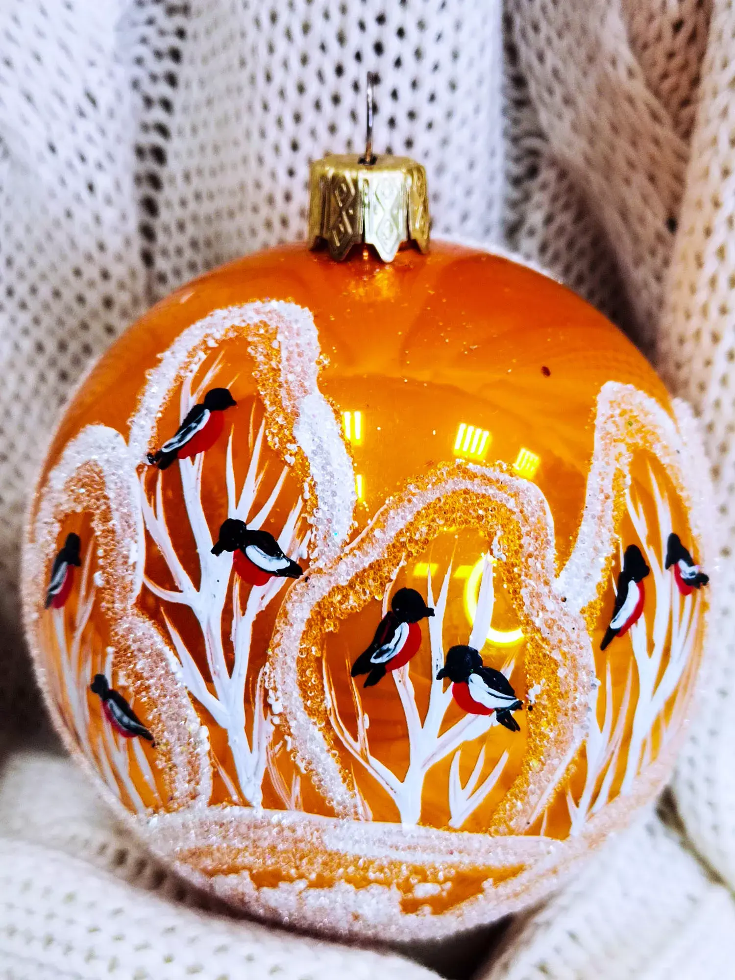 Признайтесь честно, вы ждете сказки в новогоднюю ночь? И если вы ответили на этот вопрос положительно, рекомендуем приобрести шар «Снегири в зимнем лесу». Изящные белоснежные деревца на роскошном золотом фоне – невероятно фееричное сочетание. А на деревцах – снегири, эти красивые зимние птички, всеобщие любимцы, прилетевшие из сказочного волшебного леса.