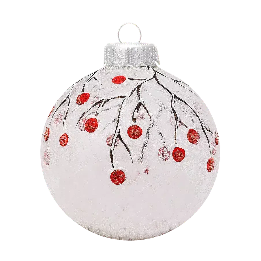 Зимние ягоды на ослепительно белом фоне – нереально прекрасная картина! Эффектный контраст алого и белого с ненавязчивыми вкраплениями черного и розового невозможно не заметить. Стеклянный елочный шар «Зимняя рябина» – настоящая находка для тех, кто способен оценить истинную красоту.