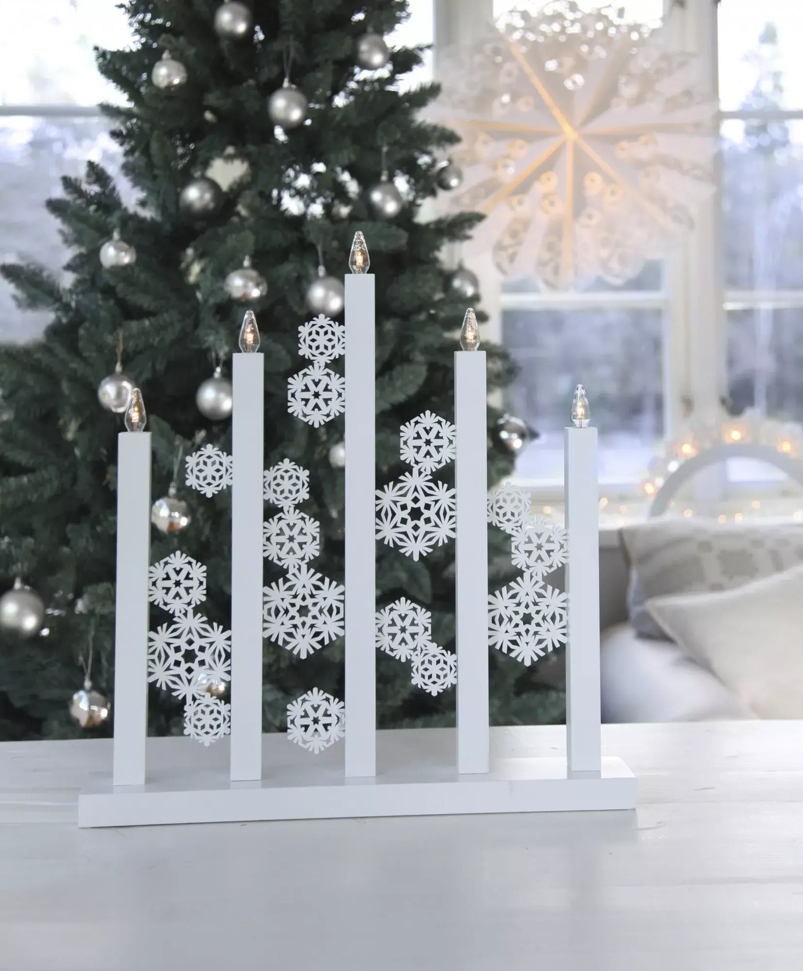 Сочетание свечей и снежинок выглядит необычно и придает изделию богатый вид. А благодаря крупному размеру (47 на 46 см) оно смотрится довольно солидно. Светильник работает от электросети – свечи загораются и гаснут благодаря легкому нажатию выключателя.