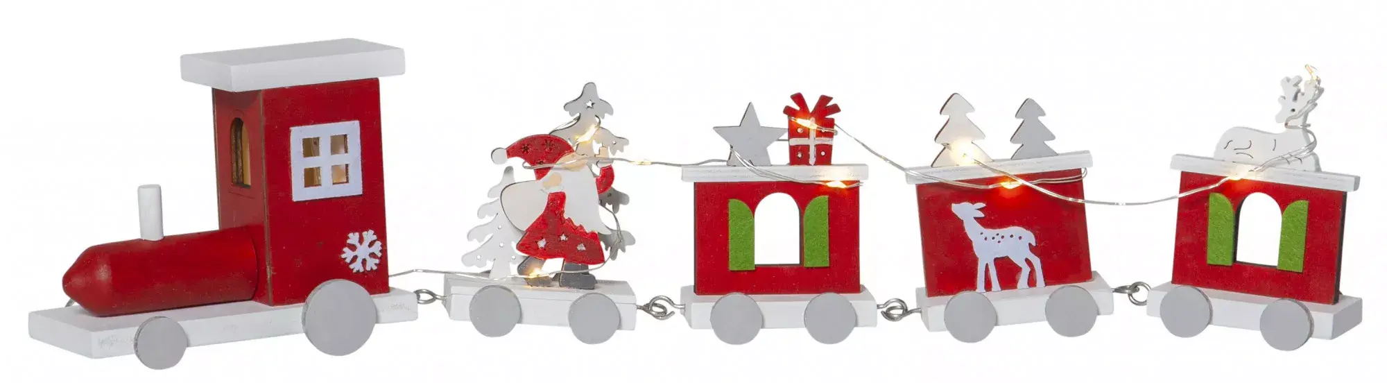 «Паровоз Счастья» выполнен в серо-белой цветовой гамме, а «Паровоз Удачи» – в красно-белой, с деталями нежно-зеленого цвета. Поставьте их под елку, и вы увидите, как эффектно они освещают корзину или мешок с подарками! Высота этих нарядных паровозиков – 10 см, длина – 46 см. Изготовлены они из дерева. Режим работы – 6 ч вкл. / 18 ч выкл.