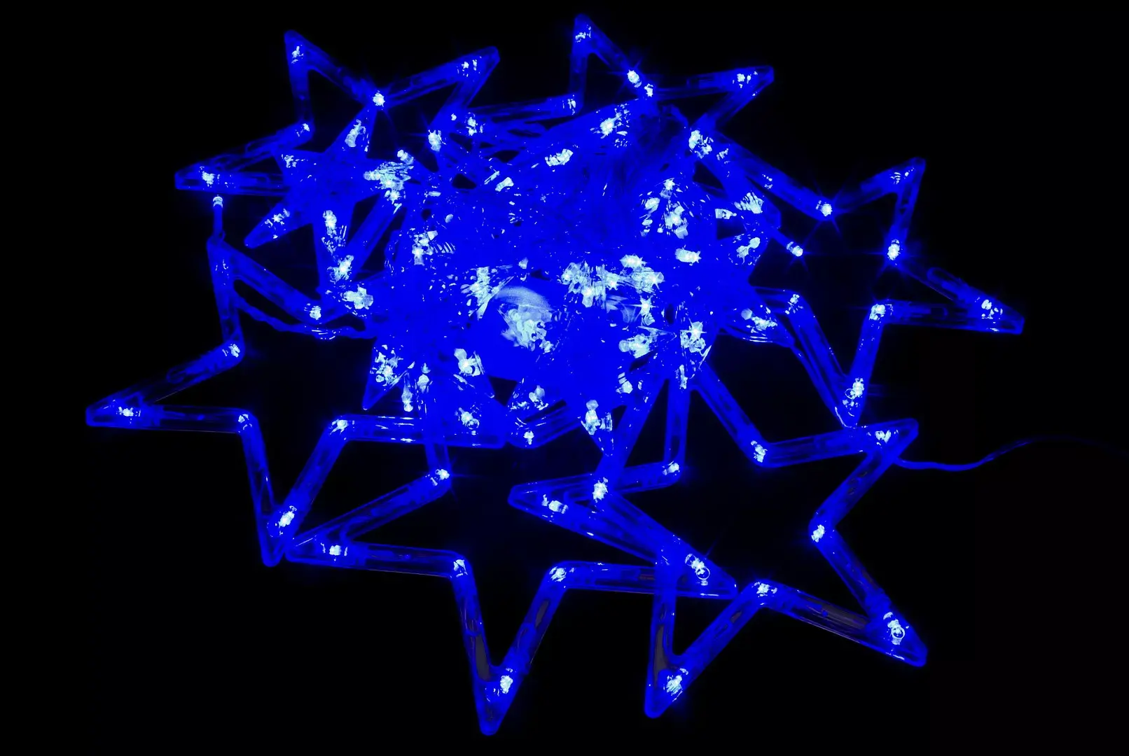 Светодиодная мерцающая бахрома, от производителя Winner, предназначена для использования внутри помещения. Длина бахромы 2.5 метра, вертикальные нити имеют длину 0.55, 0.95 метров. На бахроме имеется коннектор для соединения гирлянд в последовательную цепь. Особенностью этой модели являются фигуры в виде звезды, на концах нитей и контроллер позволяющий менять режимы свечения.