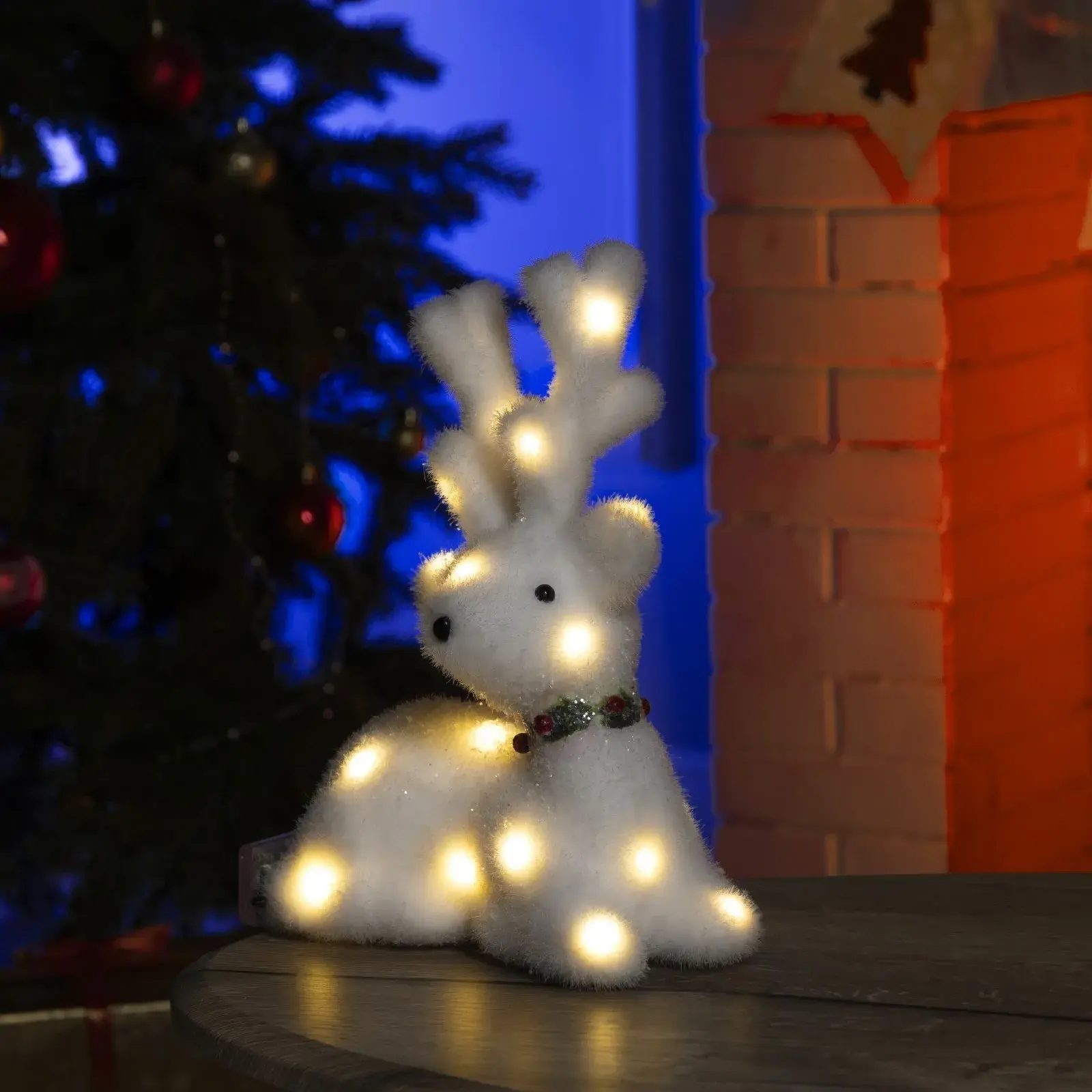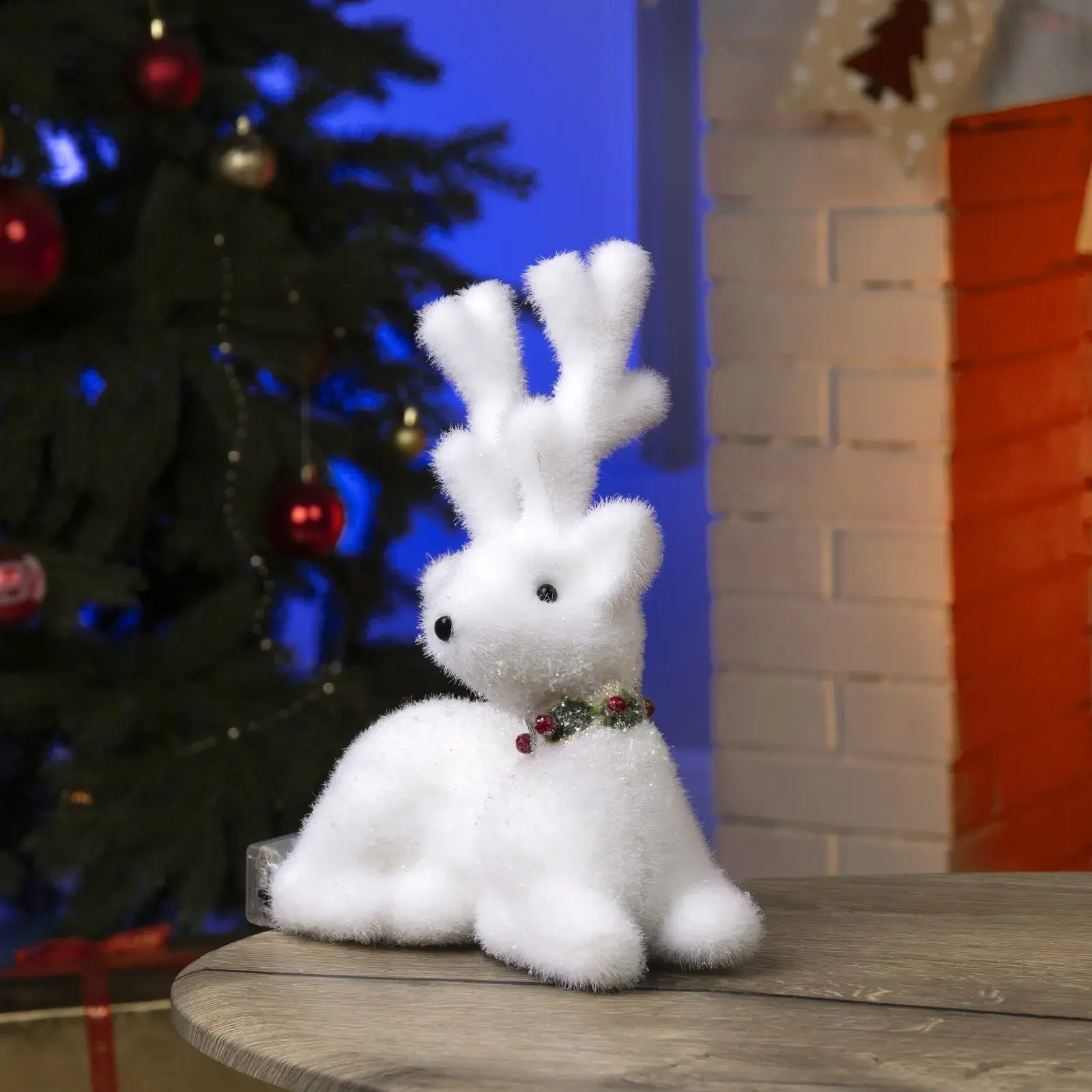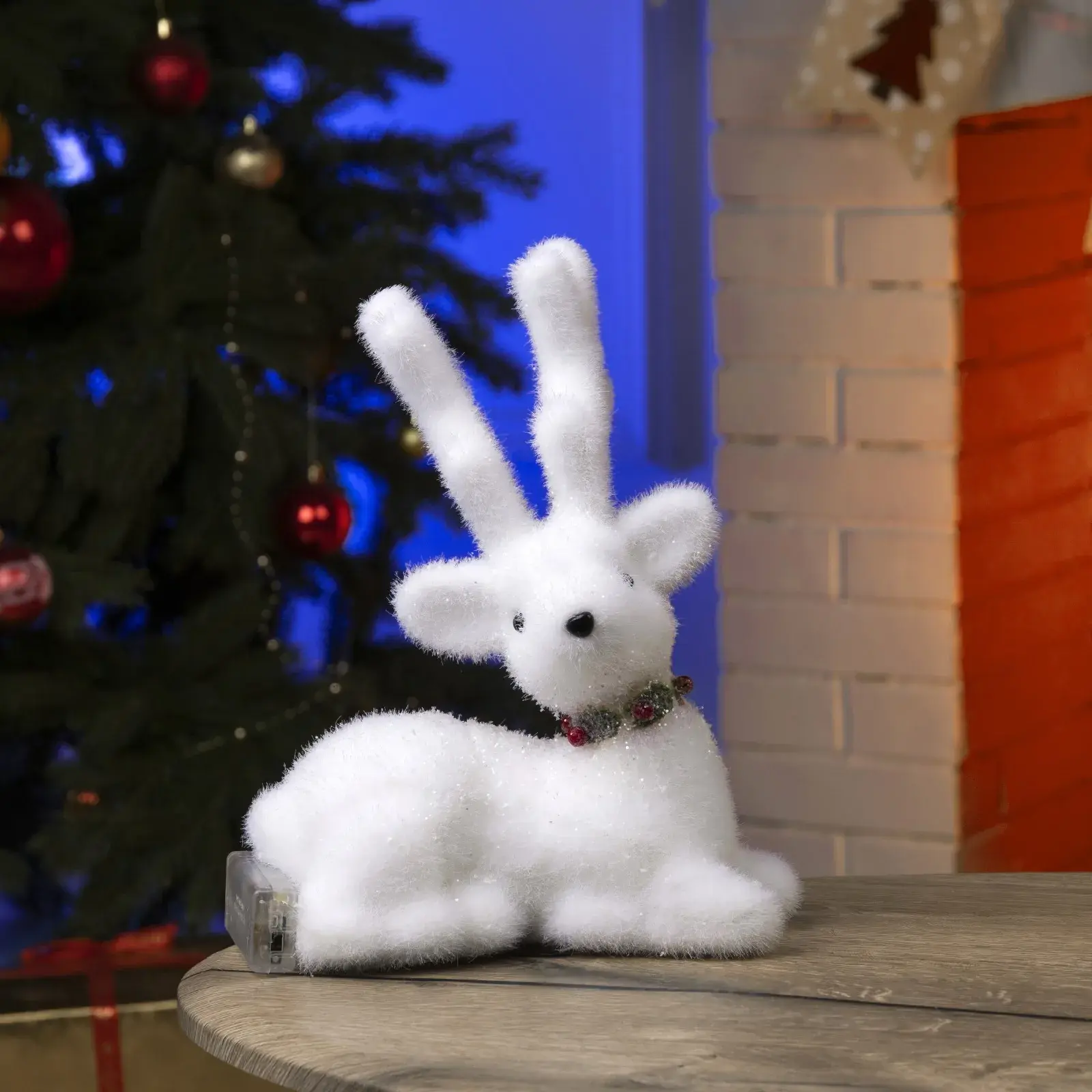 Изображение оленя в новогодней тематике актуально всегда! И если вы станете счастливым обладателем светодиодной фигуры с теплым белым свечением, изготовленной из флока, то не прогадаете. Подарите стройного красавца «Оленя» близкому вам человеку или украсьте им свой дом, и радость от предвкушения счастья в новом году будет полной! Параметры игрушки – 20 х 25 х 12 см. Работает от батареек AA х 2.