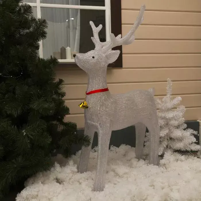 Величавый олень размером 80 × 130 × 50 см .встречает ваших гостей, вызывая неподдельный восторг у каждого из них. Его ярко-красный ошейник шикарно оттеняет эффектный окрас. В такого красавчика невозможно не влюбиться! Что касается технических характеристик изделия, то следует отметить 8 режимов, 228 LED-ламп, 24 В, белое свечение. Изделие выполнено из акрила.