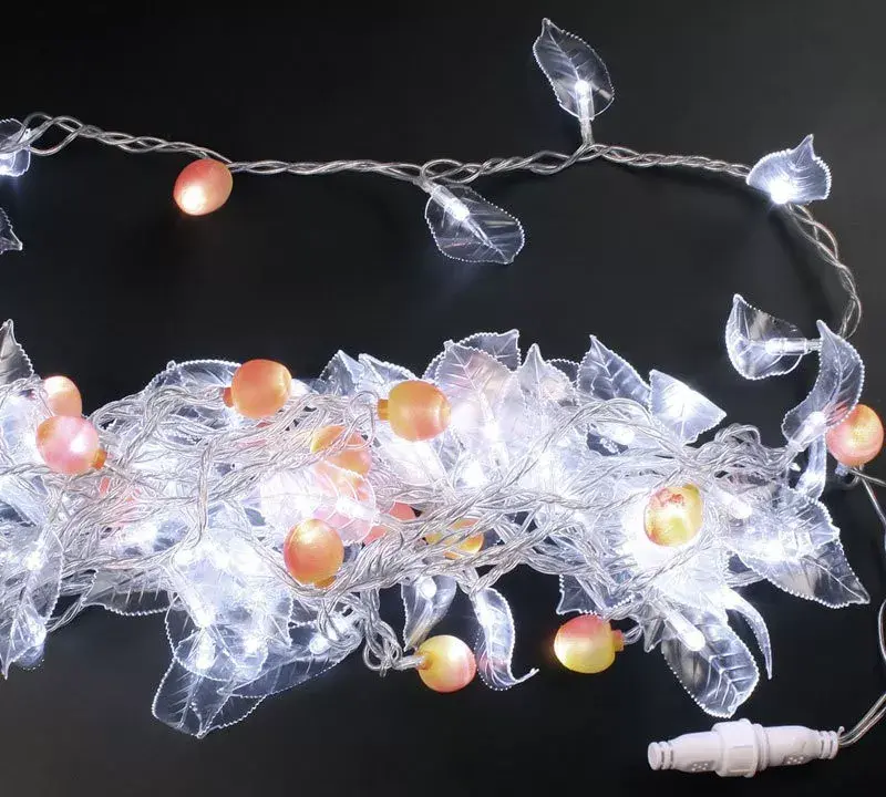 Светодиодная гирлянда декор - флора отлично подойдет для декорирования помещений! Прозрачный провод дает возможность применять гирлянду на различных цветовых поверхностях, наличие коннектора позволит соединить до 10 гирлянд и украсить большие расстояния. На гирлянде последовательно расположены листочки и ягоды, через каждые четыре листочка прикреплена ягода.