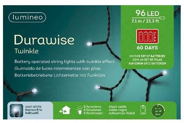 Светодиодная гирлянда на батарейках с контроллером 7.1 м., 96 холодных белых LED ламп, 3 батарейки типа АА, черный ПВХ провод, Kaemingk (497140) – купить за 1 300 ₽ | Мир Ёлок — ваш лучший выбор для создания волшебной атмосферы на Новый год!