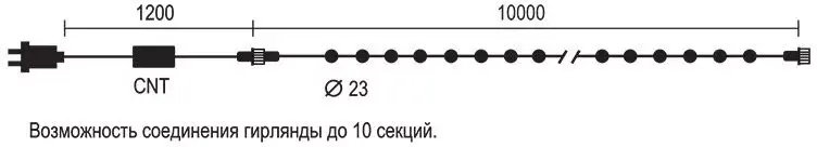 Гирлянда оборудована коннектором, который позволяет объединить гирлянды в цепочку, до 10 штук. Силовой провод с выпрямителем поставляется в комплекте. Так же гирлянду можно использовать на улице при температуре до -30оС.