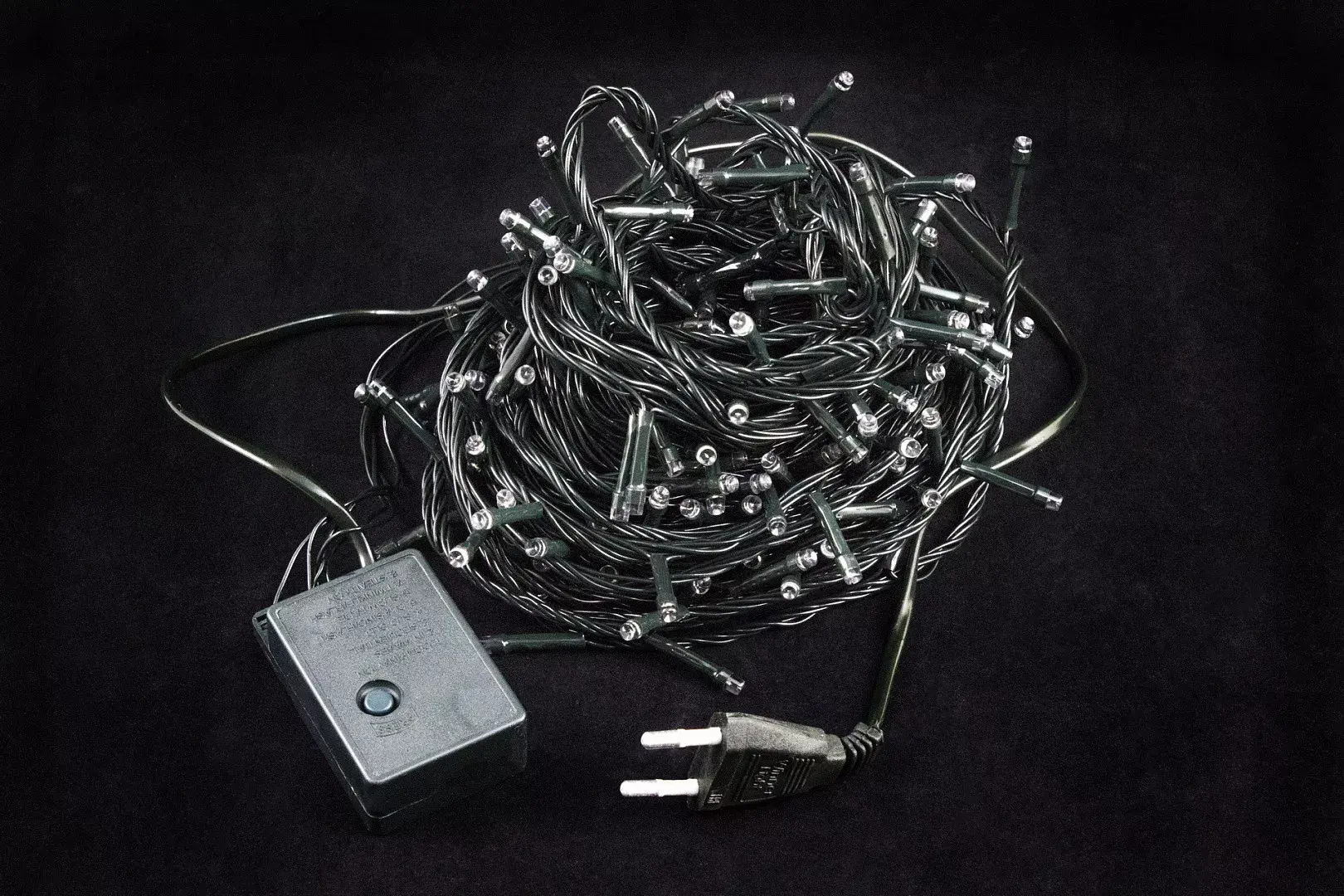 Длина гирлянды 13,5 метров, по все длине равномерно располагаются 200 LED лампочек. Провод черный, силиконовый.