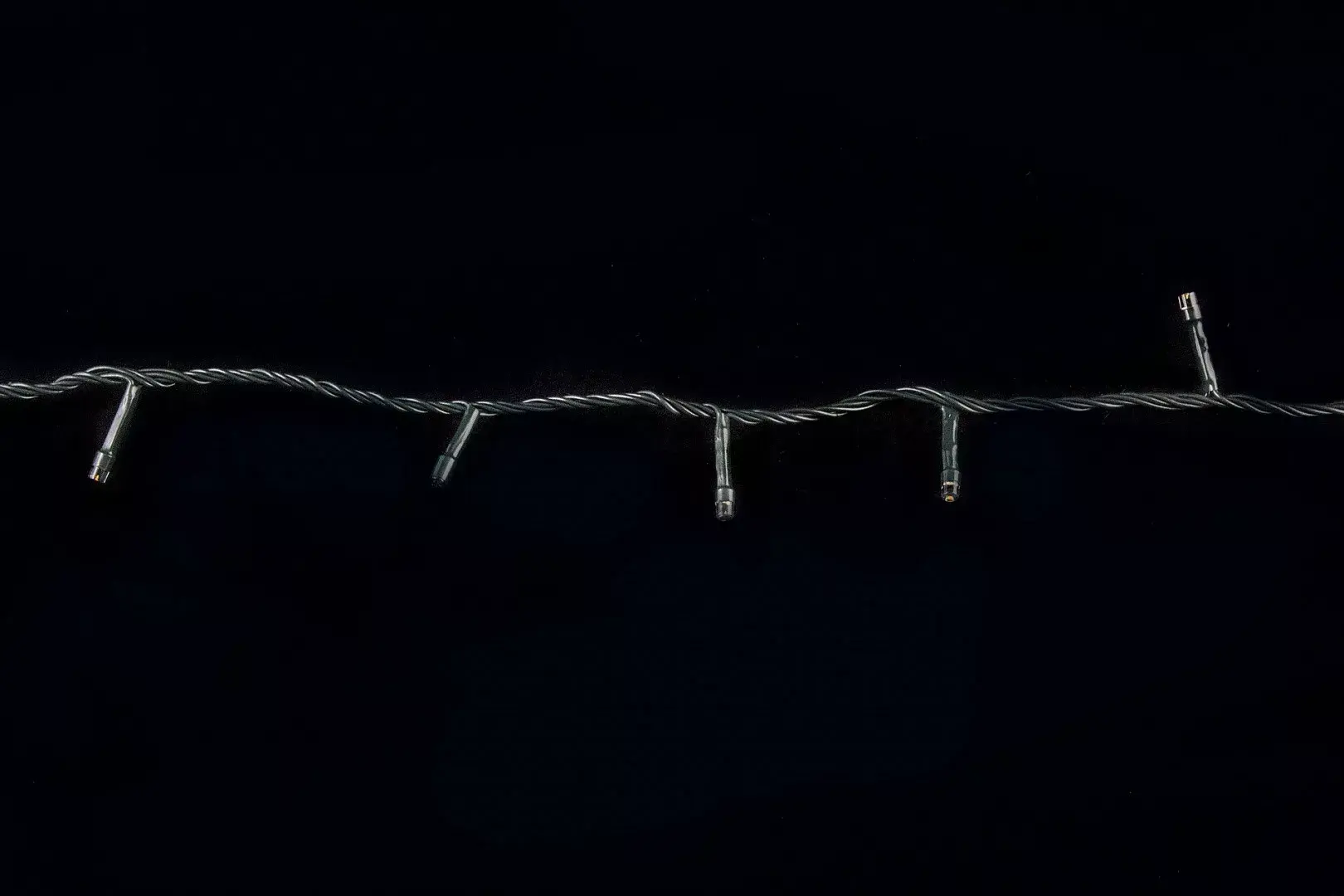 Длина гирлянды 13,5 метров, по все длине равномерно располагаются 200 LED лампочек. Провод черный, силиконовый.