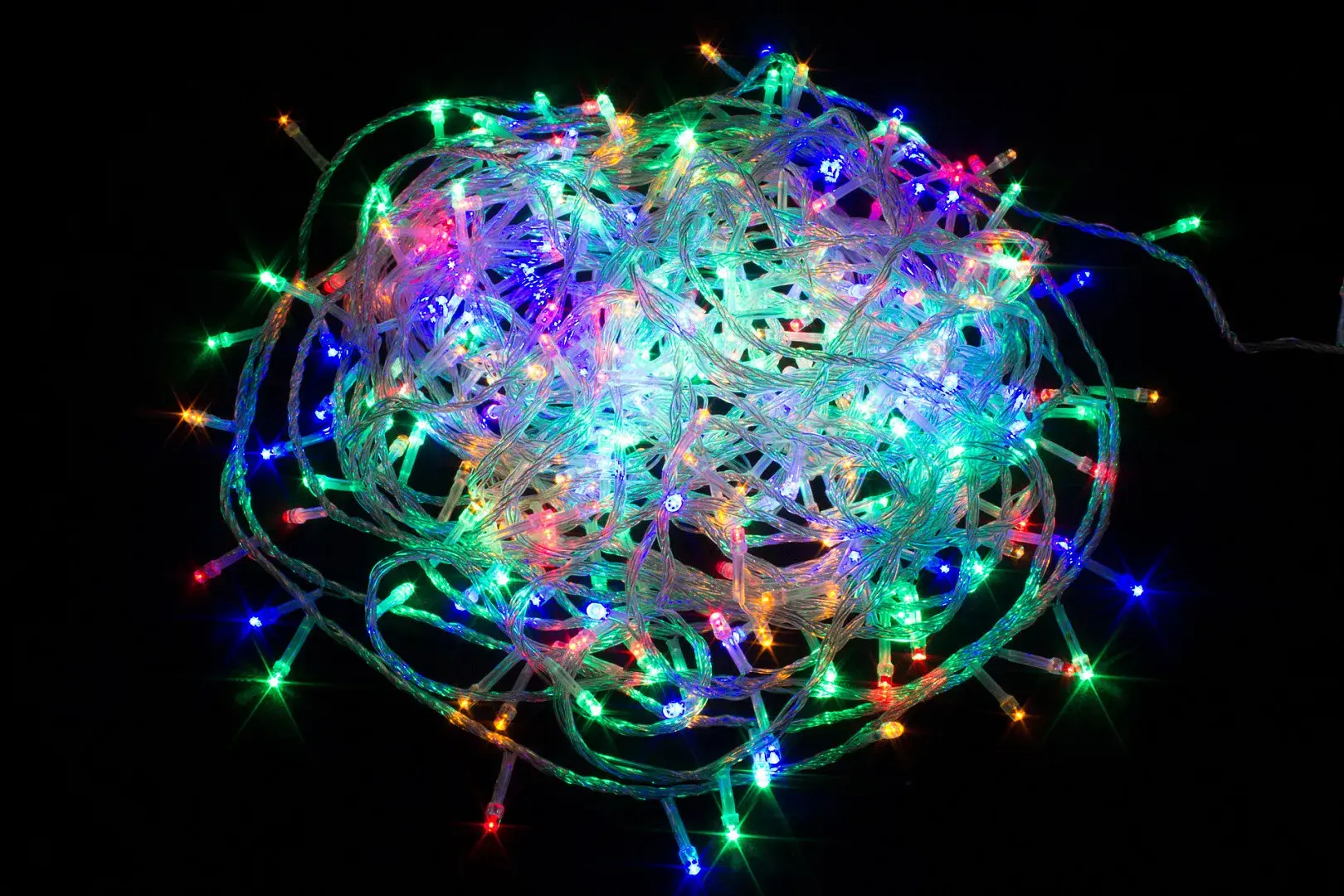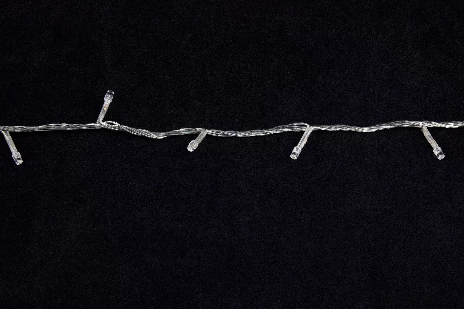Длина гирлянды 20 метров, по все длине равномерно располагаются 300 LED лампочек. Провод прозрачный, силиконовый.