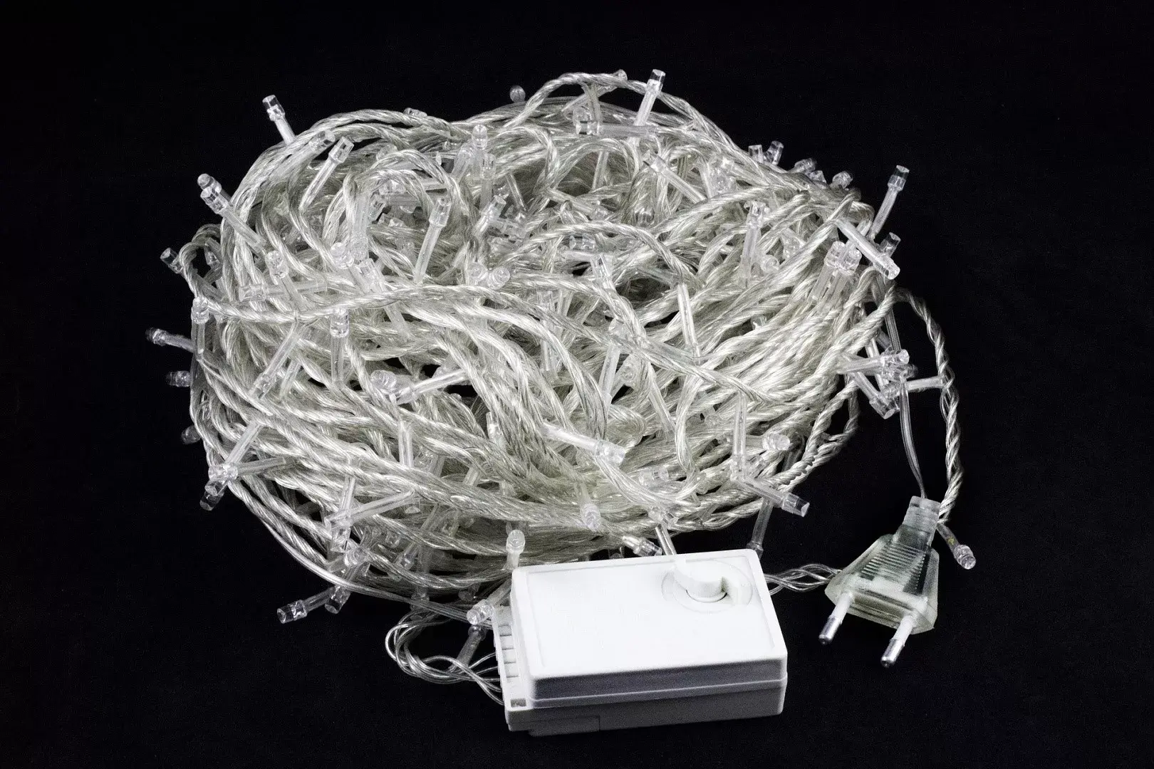 Длина гирлянды 26 метров, по все длине равномерно располагаются 400 LED лампочек. Провод прозрачный, силиконовый.