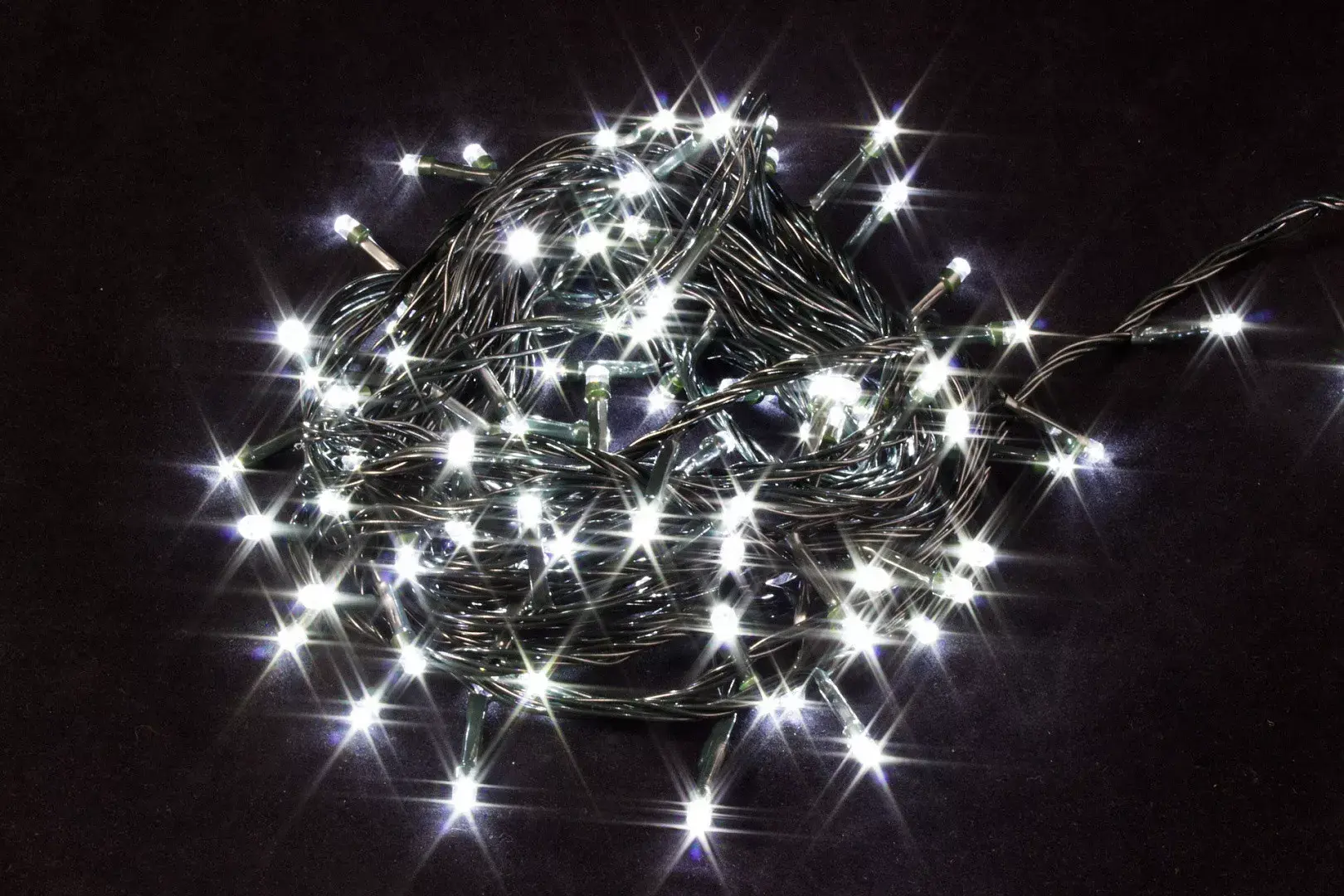 Длина гирлянды 7 метров, по все длине равномерно располагаются 100 LED лампочек. Провод черный, силиконовый.