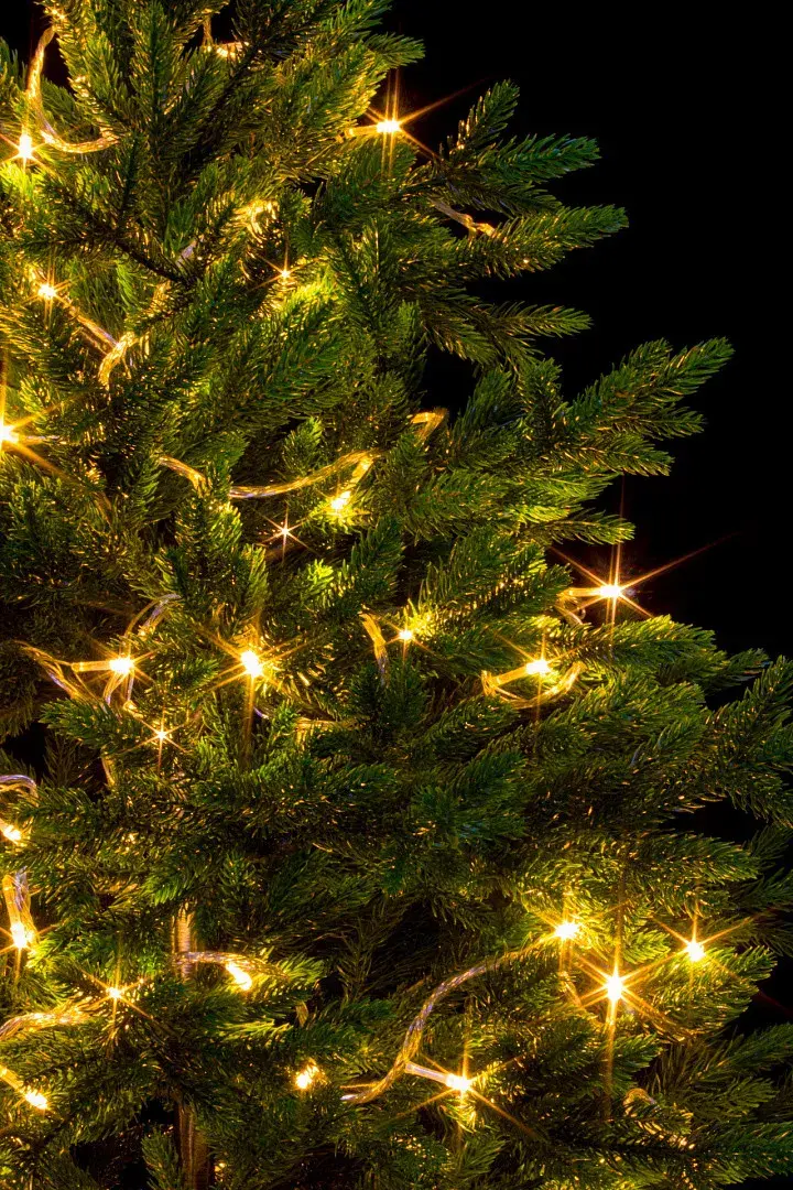 Длина гирлянды 7 метров, по все длине равномерно располагаются 100 LED лампочек. Провод прозрачный, силиконовый.