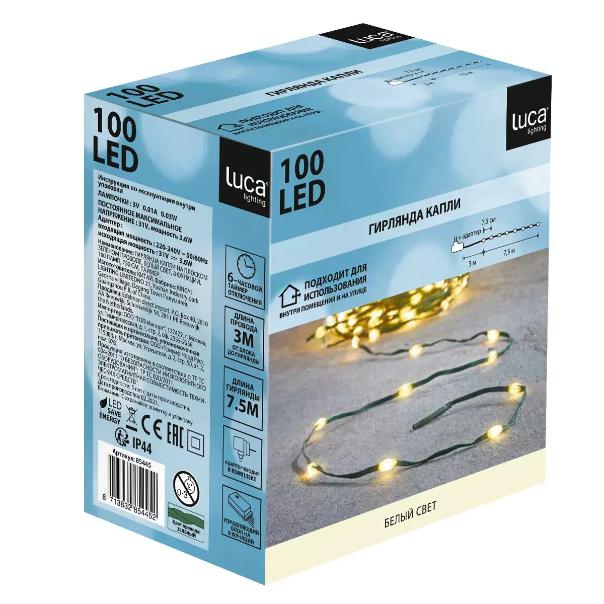 Декоративная гирлянда Капли - это изысканное украшение для Вашего праздника. Спектр применения этой гирлянды очень велик, ей можно украсить хвойную красавицу, задекорировать предметы интерьера, создать световую композицию. Особенность гирлянды в светодиодах, они выполнены в форме капли, расстояние между лампами 7,5 см. Провод плоский, хорошо гнется. Встроенный контроллер позволит подобрать Вам подходящий режим свечения из 8 предлагаемых. Для подключения гирлянды не требуются дополнительные аксессуары, она готова к использованию прямо из коробки. Гирлянды LUCA Lighting - разработаны специалистами Голландской компании Edelman, соответствуют самым высоким стандартам качества, имеют все необходимые сертификаты.