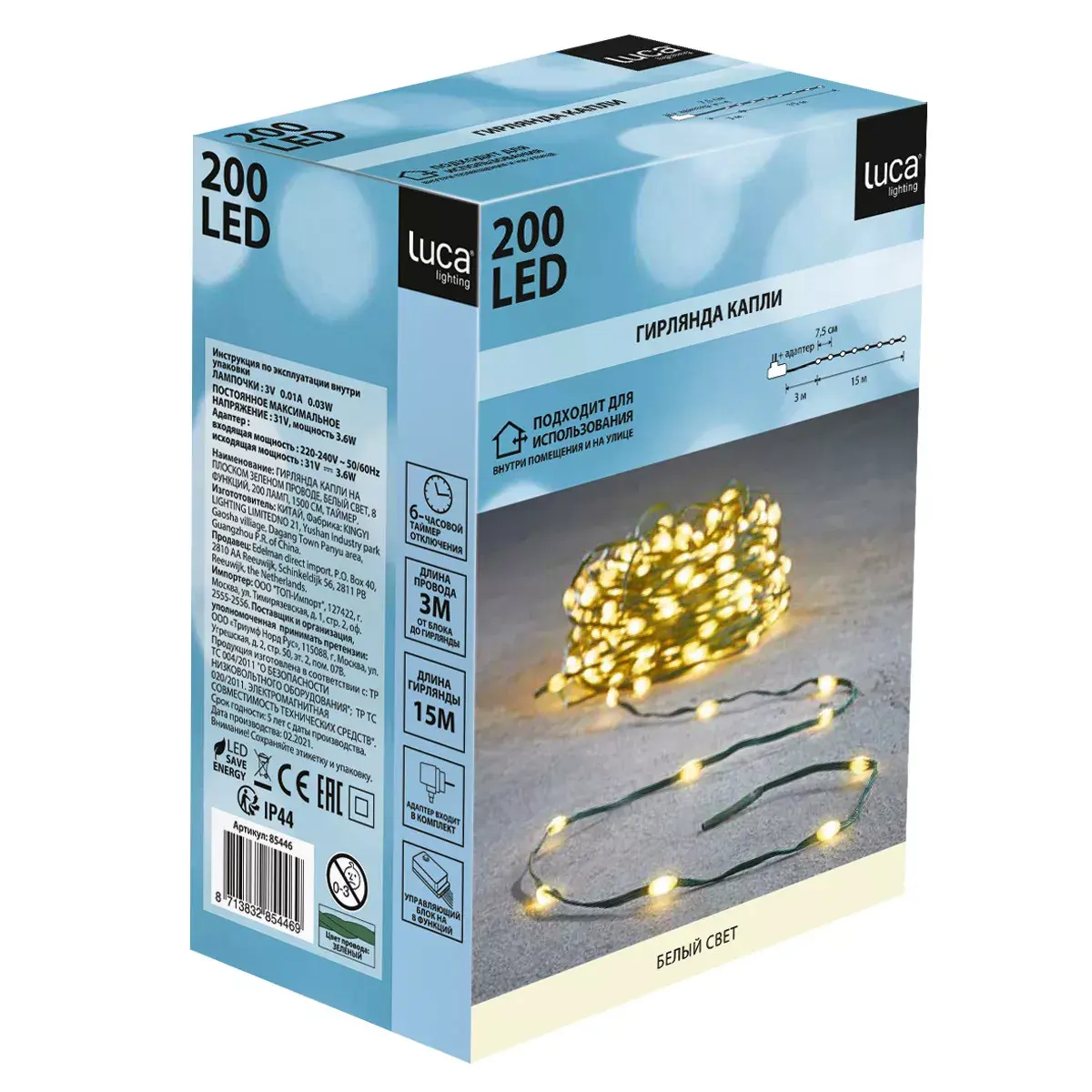 Светодиодная нить Капли 200 белых ламп, 15 м., 31В, 8 режимов, таймер, зеленый провод, LUCA (85446)