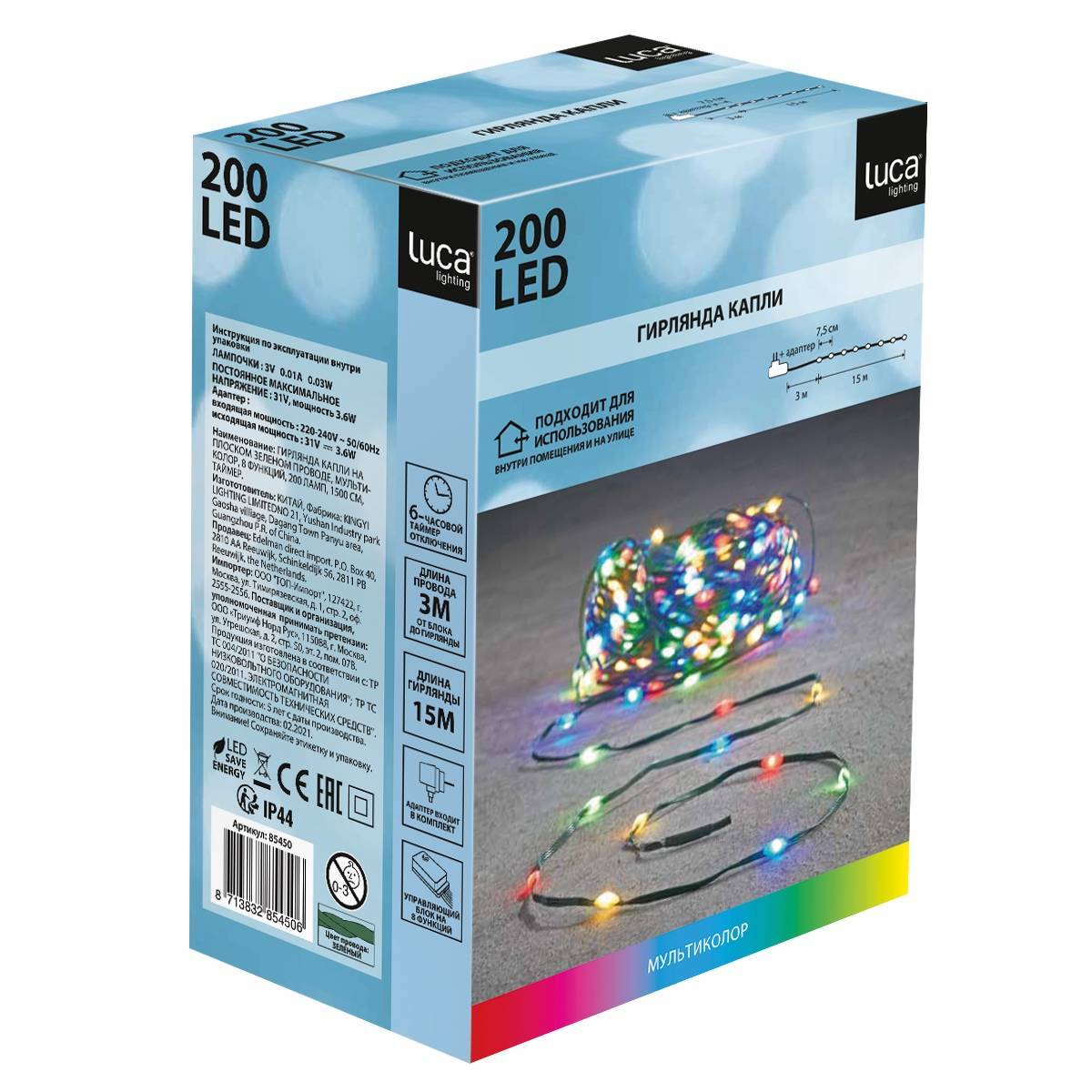 Декоративная гирлянда Капли - это изысканное украшение для Вашего праздника. Спектр применения этой гирлянды очень велик, ей можно украсить хвойную красавицу, задекорировать предметы интерьера, создать световую композицию. Особенность гирлянды в светодиодах, они выполнены в форме капли, расстояние между лампами 7,5 см. Провод плоский, хорошо гнется. Встроенный контроллер позволит подобрать Вам подходящий режим свечения из 8 предлагаемых. Для подключения гирлянды не требуются дополнительные аксессуары, она готова к использованию прямо из коробки. Гирлянды LUCA Lighting - разработаны специалистами Голландской компании Edelman, соответствуют самым высоким стандартам качества, имеют все необходимые сертификаты.