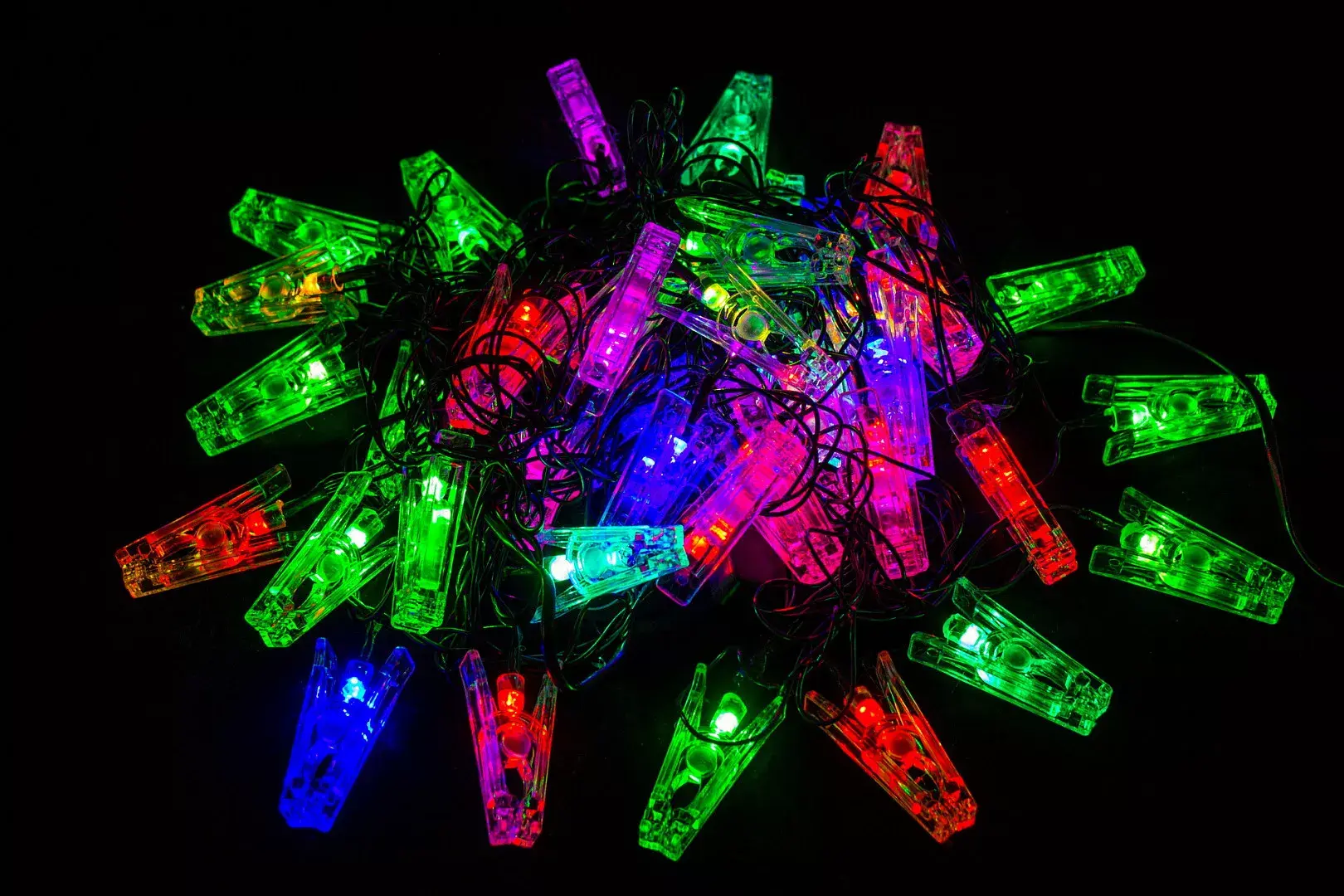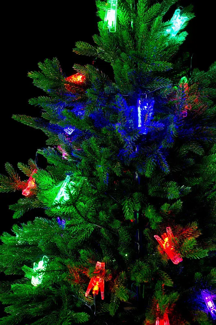 Светодиодная гирлянда в форме прищепки, станет необычным укрощением вашей хвойной красавицы. Каждая лампочка имеет 2 цвета и поочередно меняет их. Использование гирлянды возможно только внутри помещений.