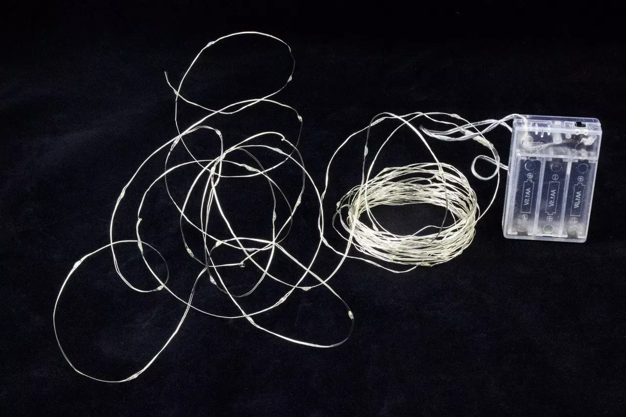 Гирлянда состоит из тонкого и незаметного провода-проволоки с 100 диодами, которые создают впечатление парящих в воздухе огоньков. Проводу можно придать любую форму и она надолго сохранится неизменной.