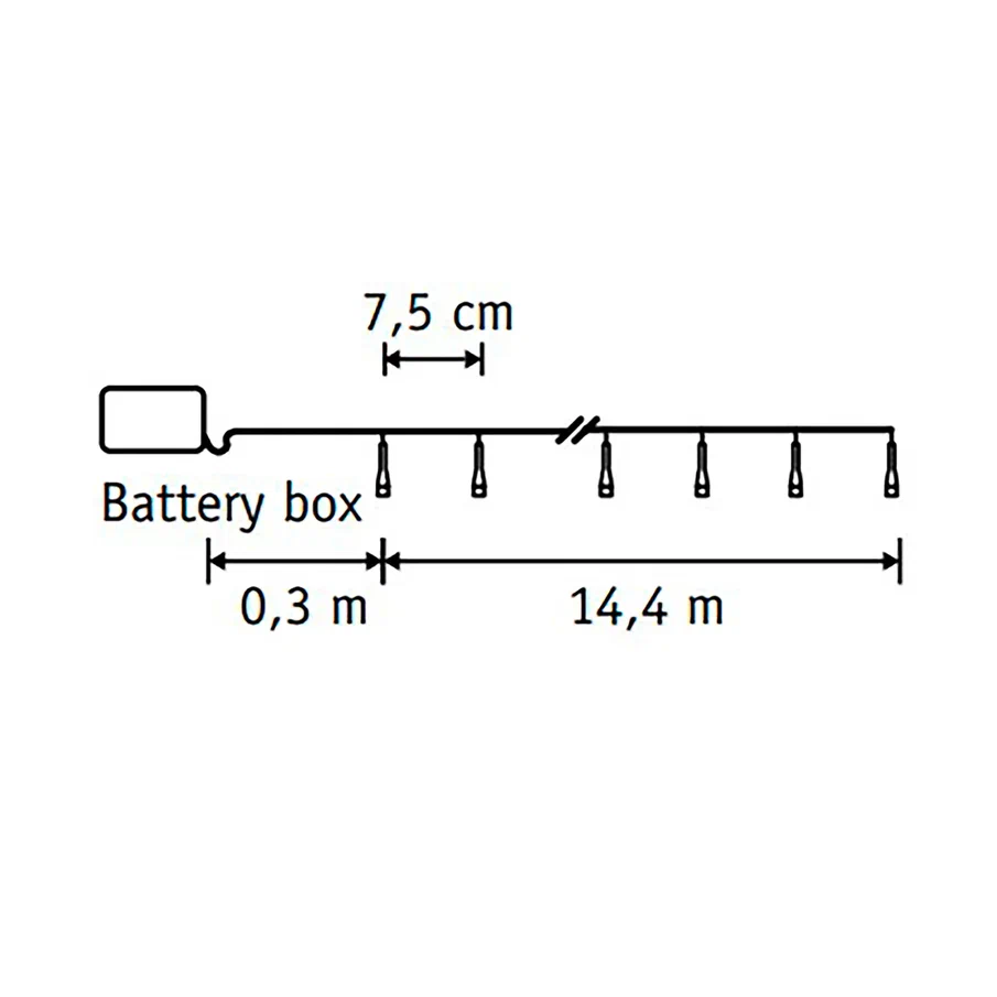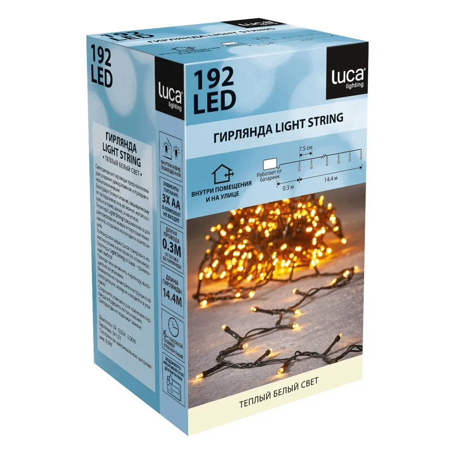 Теплый белый свет 192 светодиодных ламп создает мягкое, приятное освещение, напоминающее классические лампочки накаливания. Расстояние между лампочками в 7.5 см обеспечивает равномерное распределение света по всей длине гирлянды.