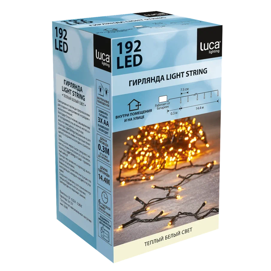 Теплый белый свет 192 светодиодных ламп создает мягкое, приятное освещение, напоминающее классические лампочки накаливания. Расстояние между лампочками в 7.5 см обеспечивает равномерное распределение света по всей длине гирлянды.