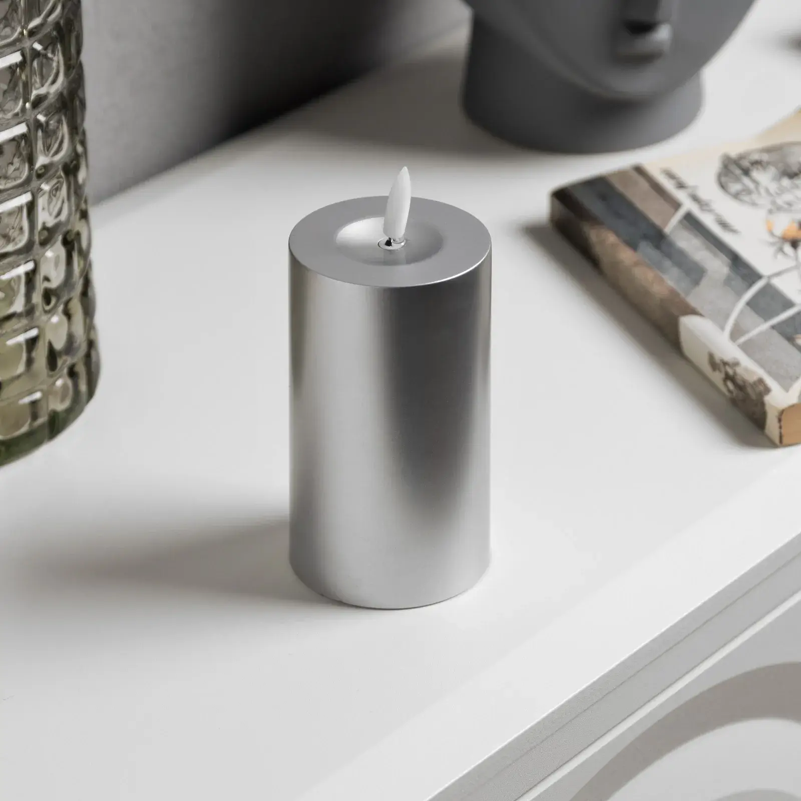 Холодный металлический блеск – это всегда стильно, шикарно и празднично! А благодаря белому теплому свечению он выглядит по-новому. Особенно, если речь идет о свече «Серебристая», предложенной вам в трех вариантах разной величины – 6 × 8 × 6 см, 7 × 13 × 7 см и 7 × 15 × 7 см. Свеча с эффектом металлик работает на батарейках и станет достойным украшением дома, кафе, ресторана.
