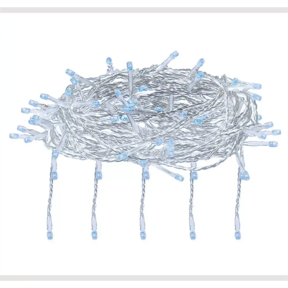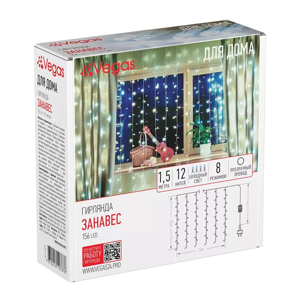 Размер гирлянды 1,5х1,5 м, длина провода 3 м, количество светодиодов 156. Цвет свечения холодный, цвет провода прозрачный. Степень защиты IP 20. Мощность 9 W. Гирлянда имеет контроллер (8 режимов работы). Использовать при комнатной температуре. Срок службы 25 000 часов.