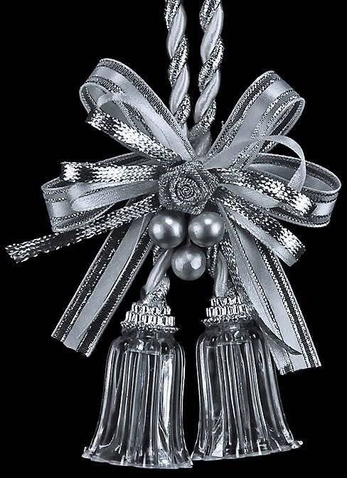 Очаровательные колокольчики украшены кокетливым бантиком из мерцающей ленты и прелестных бусинок. Когда праздничные лучи касаются этой чудесной подвески, чудится мелодичный хрустальный перезвон и в дом прилетает весёлое новогоднее волшебство.