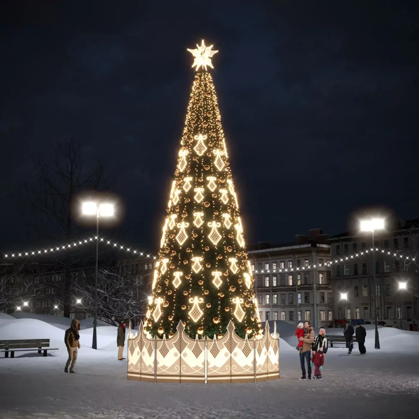 | Перечень компонентов | Ёлка: сталь с покраской, хвоя, пластиковые шары, светодиодная нить Мотивы: алюминий, поликарбонат, плёнка, светодиодная лента Ограждение: алюминий, поликарбонат, плёнка, прожектор Навершие: сталь, поликарбонат, пленка, светодиодная лента |