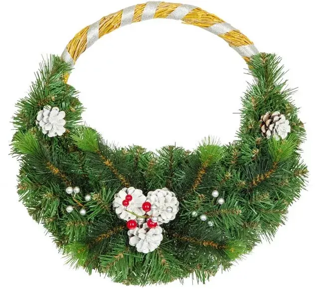 Новый год — это не только бой курантов в ночь с 31 декабря на 1 января, бенгальские огни и звон бокалов. Праздничное настроение должно появиться задолго до сказочной ночи. Поэтому даже на работе или дома многие стараются создать атмосферу Нового года и украшают помещение. Предлагаем вашему вниманию Рождественский венок «Лоза» с шишками и ягодами от производителя ЕлкиТорг. Коллекция представлена в трех цветах: золотой, красный и серебристый, позволяя выбрать декор, подходящий именно под Ваше цветовое решение. Хвойный венок выполнен из высококачественного ПВХ высшего качества, Лески, и украшен натуральными шишками и искусственными ягодами красного цвета. Это преимущество - большой плюс, так как не требует дополнительного украшения. Венок имеет жесткий каркас, легко крепится в нужное место. Изделие будет радовать Вас не один год, не теряя своей красоты!