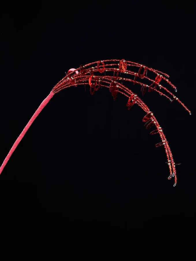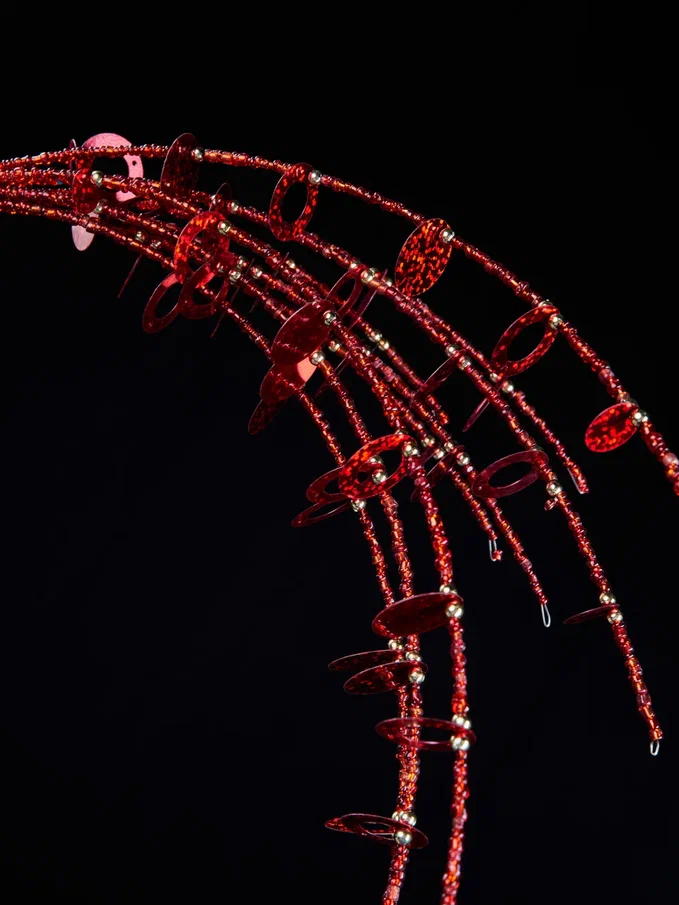 Красное с золотым – одно из самых беспроигрышных праздничных сочетаний. Эти сочные, теплые оттенки моментально поднимут настроение и согреют душу, наполнив ее предвкушением счастья в грядущем году. Ветвь «Алые паруса» из бисера и пайеток выглядит нарядно и по-настоящему празднично. Оригинальное плетение и причудливые переливы – отличительные черты этого чудного декора.