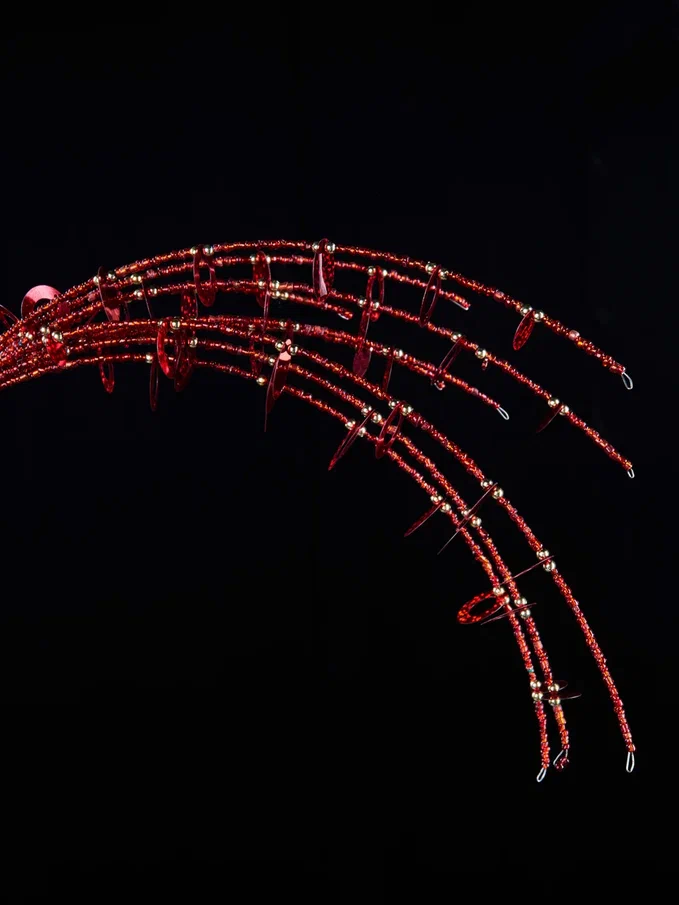 Красное с золотым – одно из самых беспроигрышных праздничных сочетаний. Эти сочные, теплые оттенки моментально поднимут настроение и согреют душу, наполнив ее предвкушением счастья в грядущем году. Ветвь «Алые паруса» из бисера и пайеток выглядит нарядно и по-настоящему празднично. Оригинальное плетение и причудливые переливы – отличительные черты этого чудного декора.