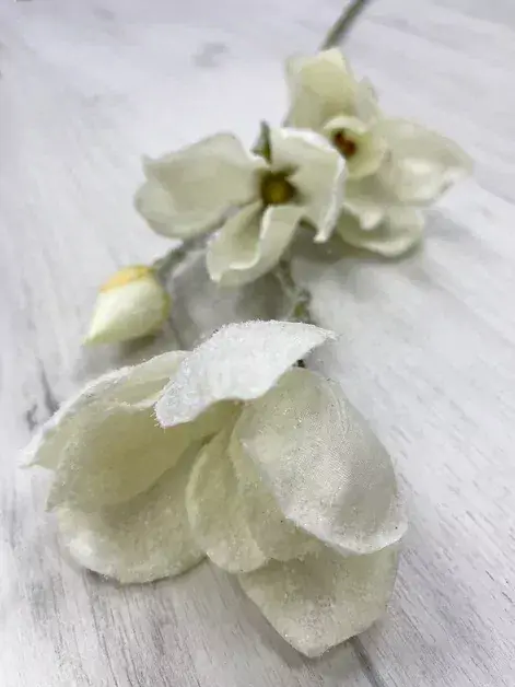 Как вам одна из свежих и шикарных идей – украсить новогоднюю елку цветами? Если вы «за», то точно на верном пути, ведь елочные украшения в виде цветов – один из самых популярных трендов. Магнолия кипенно-белого цвета выглядит удивительно реалистично. Кажется, еще секунда – и она начнет источать свой дивный, поистине упоительный аромат. Цветок довольно крупный – 85 см.