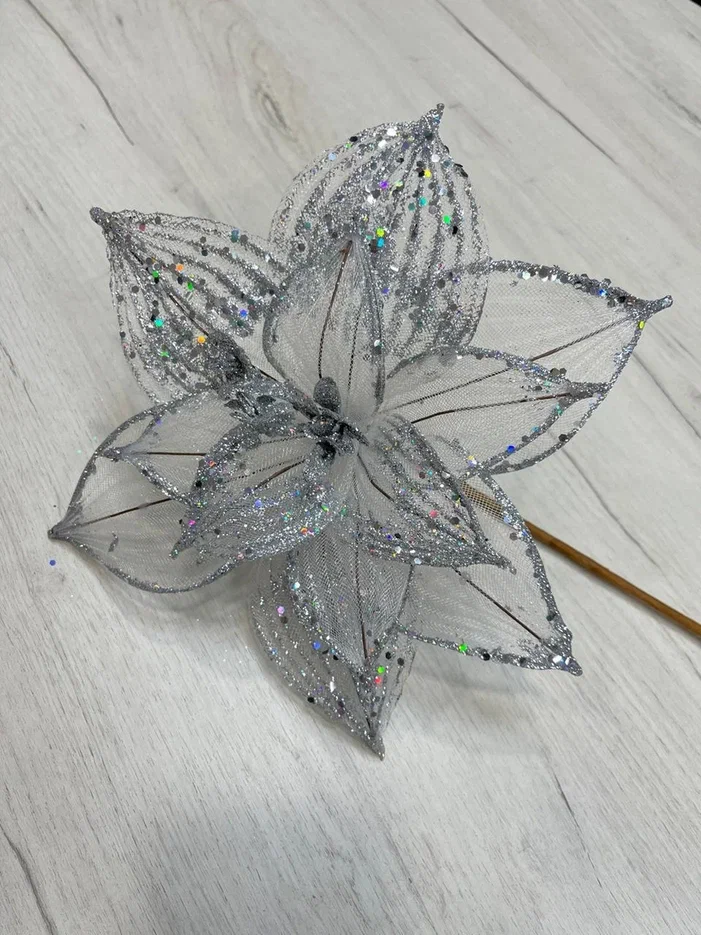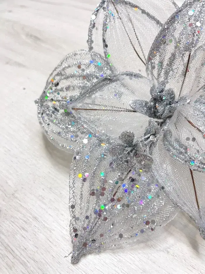 Изящные формы всегда в тренде, а значит, серебристая веточка «Пуансеттия», напоминающая штрих морозного узора – актуальное новогоднее украшение. Этот стильный декор гармонично впишется в любую новогоднюю композицию и сделает ее завершенной.