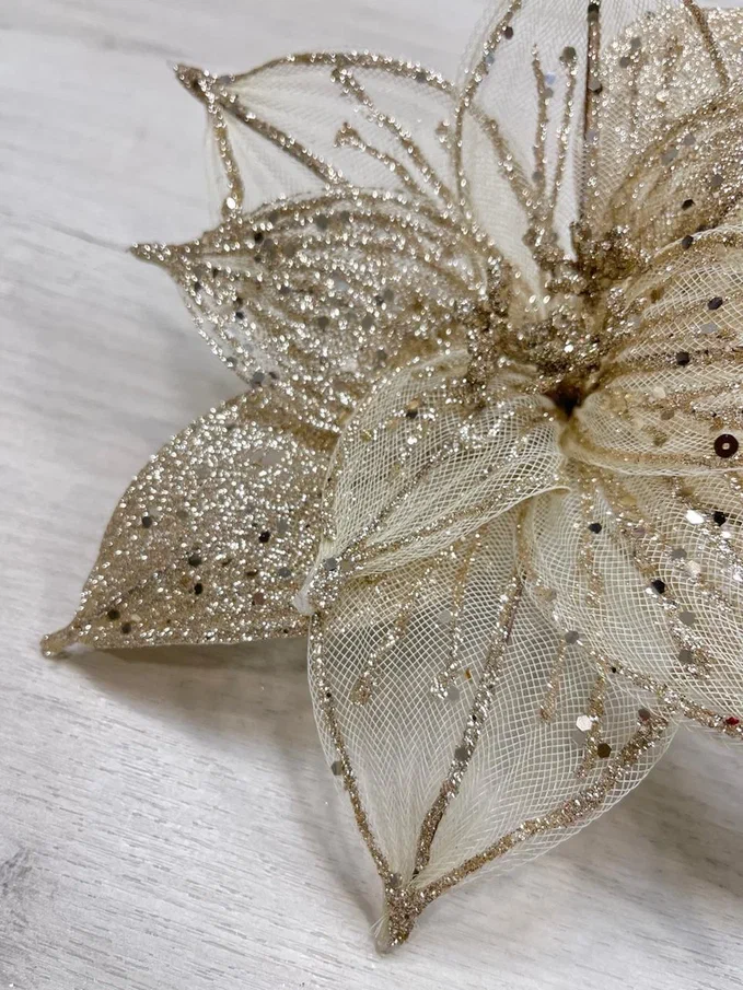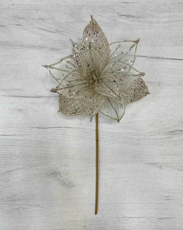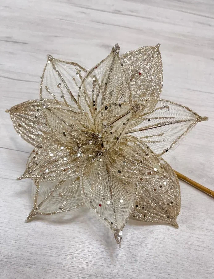 Цвет шампань по праву считается одним из самых стильных и изысканных. Поэтому веточка «Пуансеттия» такого оттенка стала настоящим хитом продаж. Посмотрите, как она прекрасна и изящна! Такое украшение придаст новогодней композиции пикантности и шика.