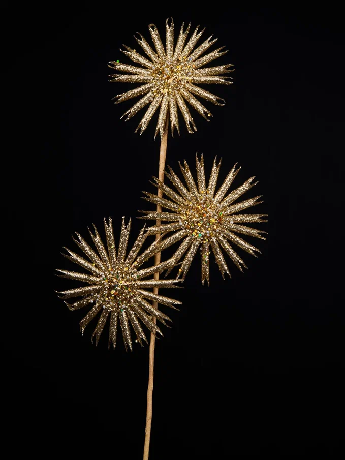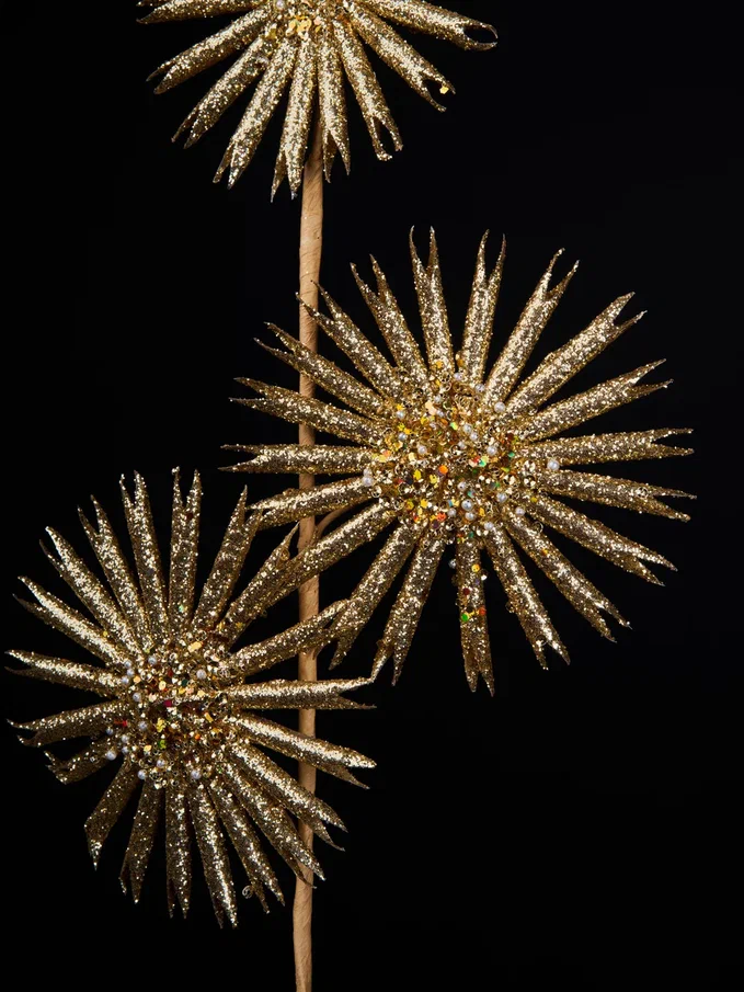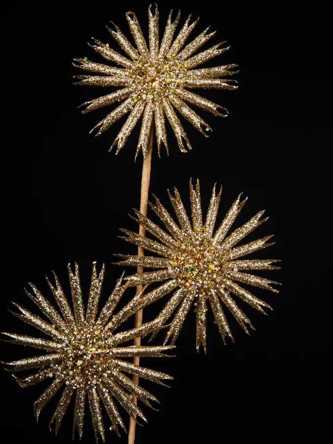 Новогодний декор – это не только привычные игрушки и гирлянды. Очень облагораживают и украшают дом разнообразные композиции с ветками и цветами. Вот и данная золотая ветка с похожими на облачка цветами как нельзя кстати придется для создания модных композиций и праздничных букетов. Золотые растения хорошо комбинируются с зелеными ветками хвои и красными ягодами.