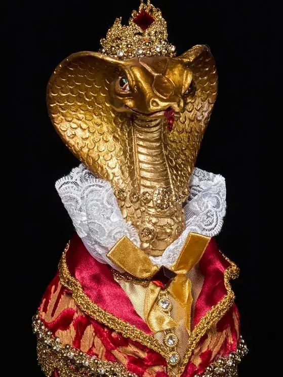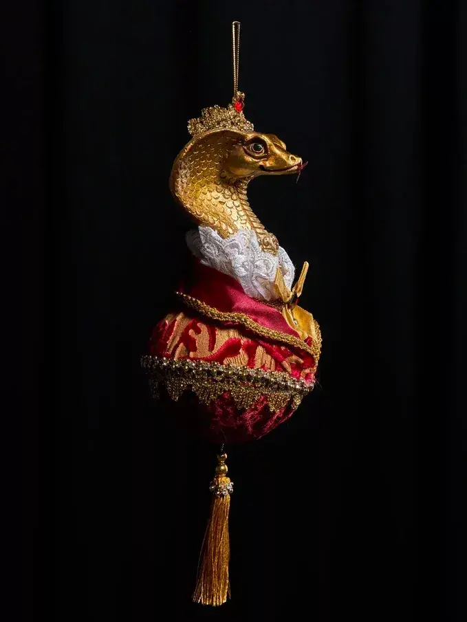 Импозантный Змей, символ наступающего года, спешит поздравить вас и передать самые добрые пожелания! Ну, а мы, в свою очередь, предлагаем вашему вниманию элегантное винтажное украшение «Королевский Змей на шаре». Красавчик в красно-золотом праздничном наряде – настоящий франт! Украшение смотрится очень эффектно и не останется незамеченным среди других елочных игрушек.