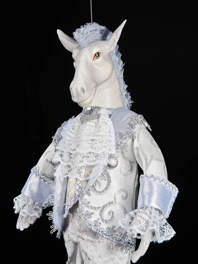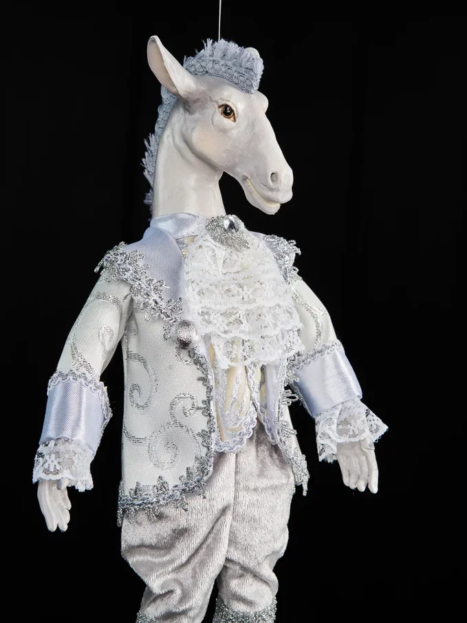 - Дизайн: Украшение изображает коня в царском наряде с бело серебристыми элементами, что подчеркивает его роскошный вид.
