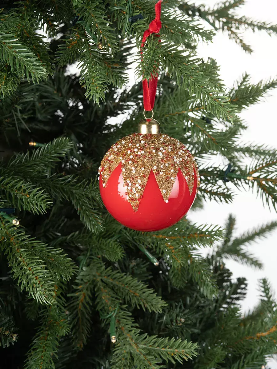 «Коварство и любовь» – самое подходящее название для этого винтажного елочного украшения, выполненного в радующих глаз цветах – красном и золотом. За счет того, что золотое обрамление сделано в виде присыпки, шар смотрится более объемным, а это гарантировано притянет к нему множество восторженных взглядов. Наиболее выигрышно «Коварство и любовь» смотрится на елке белого или ярко-зеленого цвета.