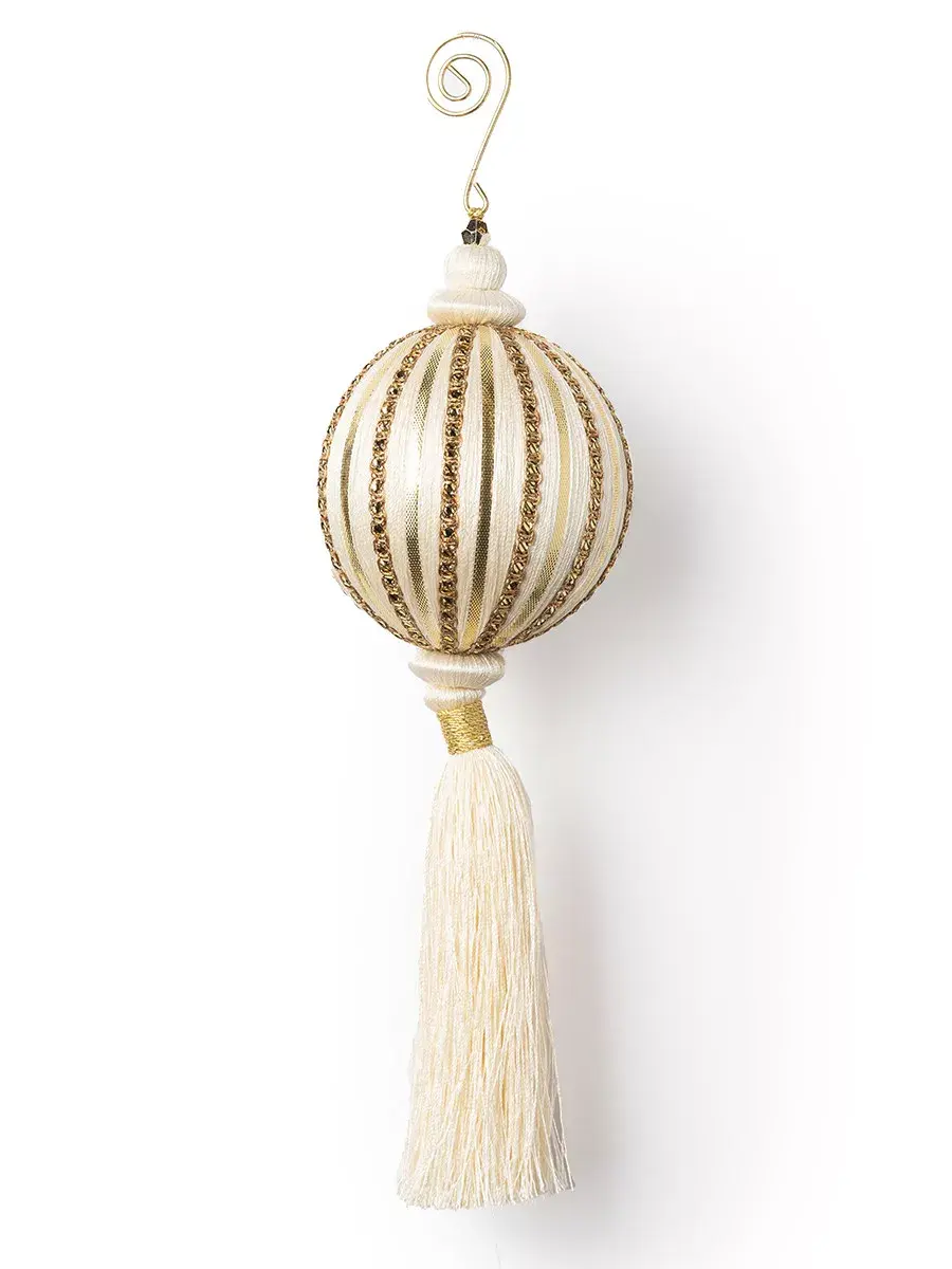 Елочный шар, дополненный кокетливой шелковистой кистью – один из актуальных вариантов новогодних украшений. Винтажный стеклянный шар цвета белого золота «Сансара» выглядит роскошно и торжественно, а благодаря белоснежной кисточке привычный елочный декор смотрится по-новому. Свежо и стильно! Модель «Сансара» привлечет внимание тех, кто идет в ногу со временем, ведь винтажное вовсе не означает устаревшее!