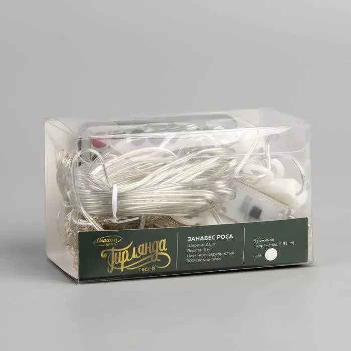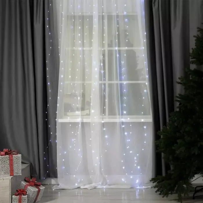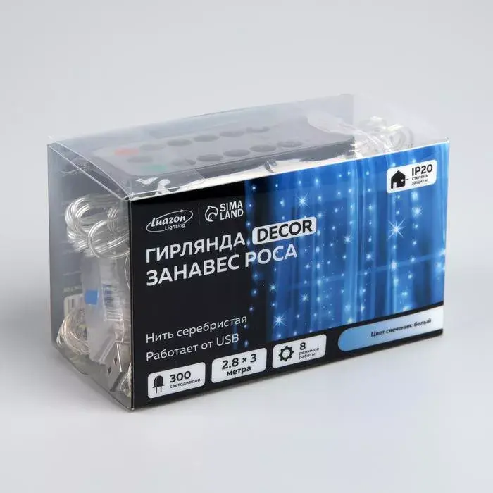 Занавес-роса, похожая на сказочный водопад – модель для тех, кто идет в ногу со временем. Гирлянда от Luazon Lighting из 300 белых LED-ламп не только нереально красивая, но и многофункциональна. Пульт дистанционного управления, степень защиты IP20, 8 режимов, USB – все для вашего комфорта! Изделие крепится на крючки. А серебристая нить делает гирлянду еще эффектнее.