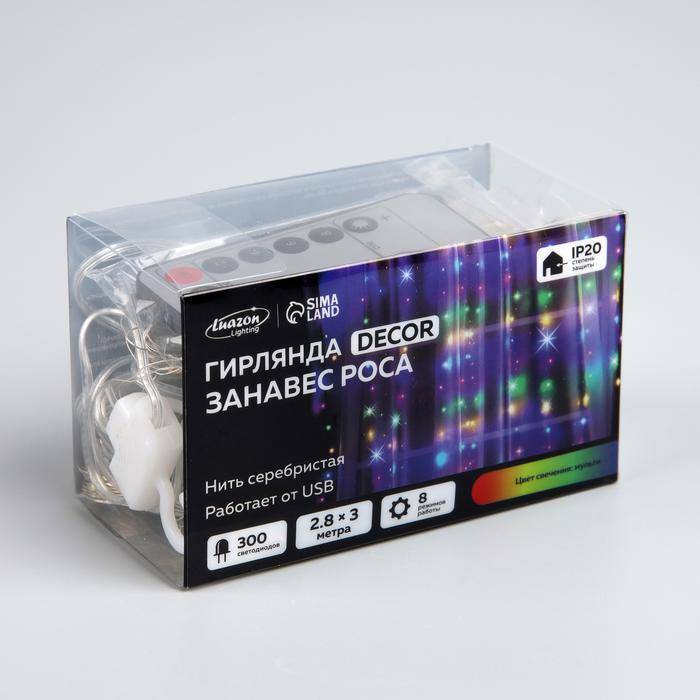 Занавес-роса 2.8×3 м. на крючках, пульт, IP20, серебристая нить, 300 мульти LED, 8 режимов, USB, Luazon Lighting (4814715) – купить за 1 100 ₽ | Мир Ёлок — ваш лучший выбор для создания волшебной атмосферы на Новый год!